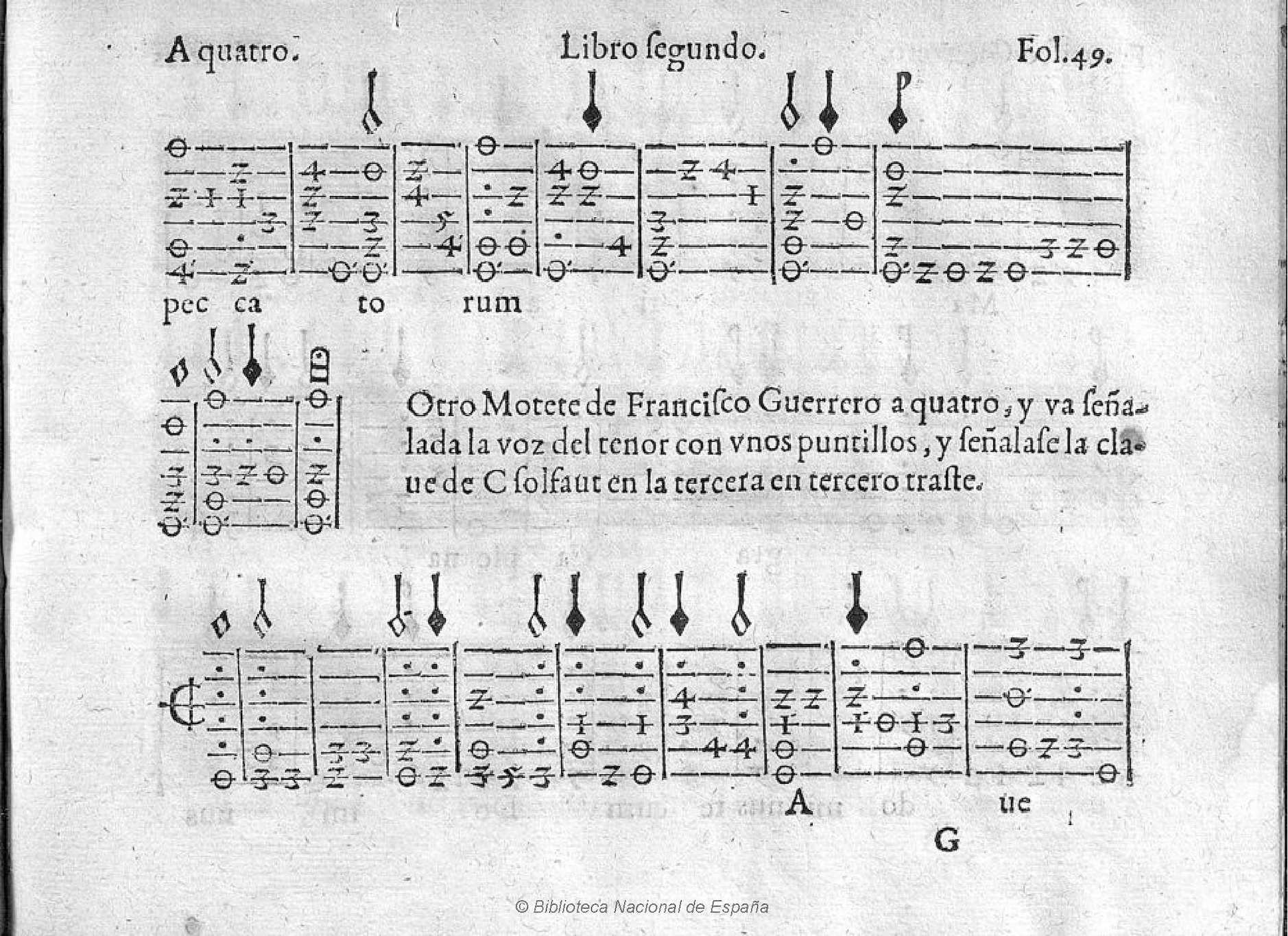* Fol. 49r-52. Ave Maria, gratia plena. “Otro motete de Francisco Guerrero a cuatro y va señalada la voz del tenor con unos puntillos y señálase la clave de Csolfaut en la tercera en tercero traste”.