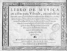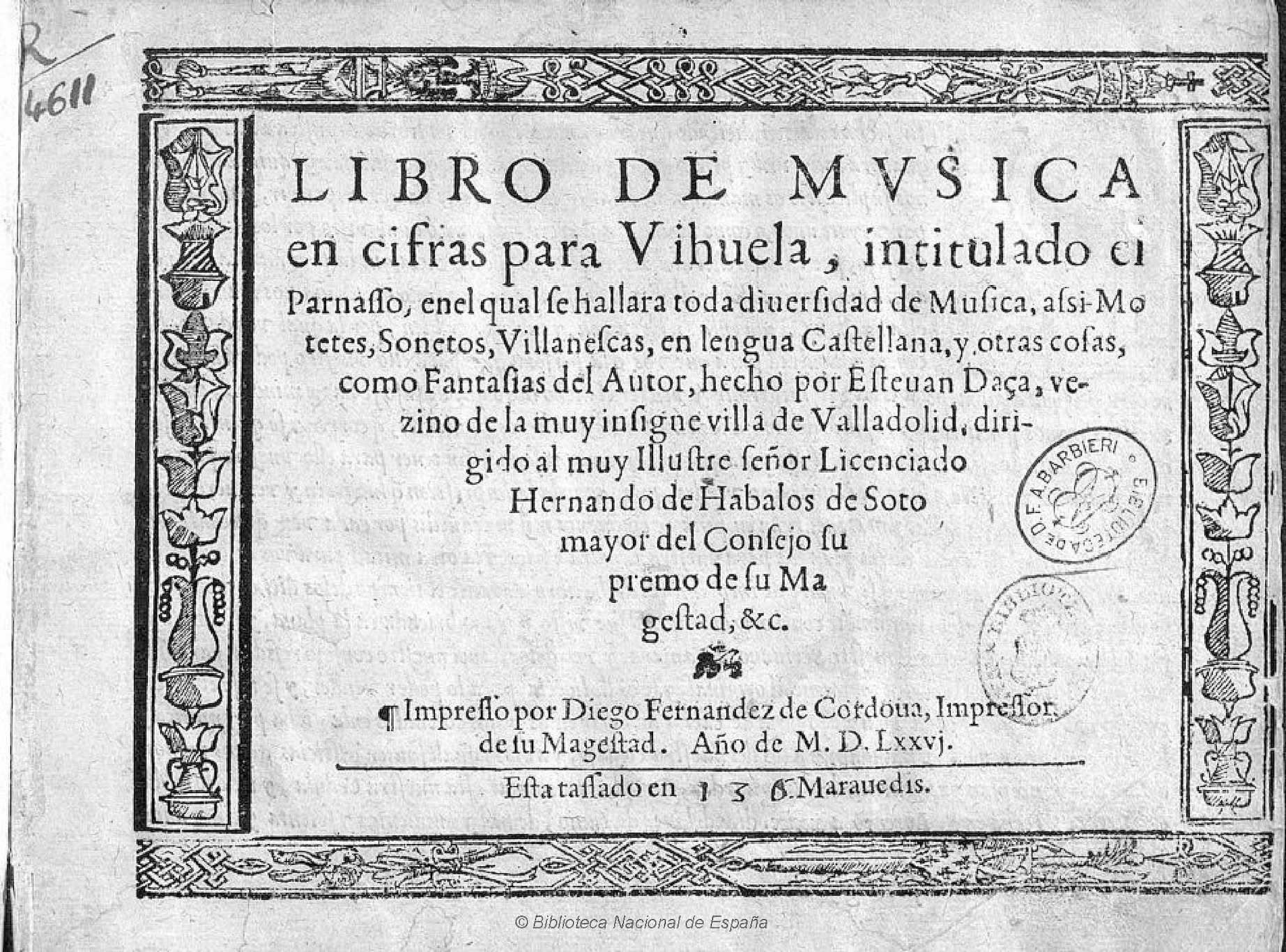 La circulación y recepción de la obra de Francisco Guerrero en fuentes instrumentales fue muy importante, tanto en impresos de vihuelistas como, especialmente, en los libros copiados para uso de ministriles. En este caso, para el proyecto Cartografiando Francisco Guerrero: música y contextos, me centraré en las obras del compositor incorporadas por Esteban Daza en su Libro de música en cifras para vihuela, intitulado el Parnaso [15768]. El libro fue impreso en Valladolid por Diego Fernández de Córdoba (I) en 1576. Se ha conservado el contrato de impresión establecido por Daza con Fernández de Córdoba, el cual nos aporta una valiosa información sobre cómo debía llevarse a cabo todo el proceso, número de ejemplares, coste de impresión, etc. Se imprimieron 1.500 ejemplares del libro de Daza, que fueron tasados para su venta en 136 maravedís, lo que nos da una idea del mercado potencial existente para los libros de vihuela, favorecido por su razonable precio de adquisición, y por lo tanto de la amplia difusión que pudieron tener las obras que contenía.