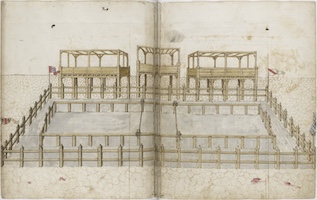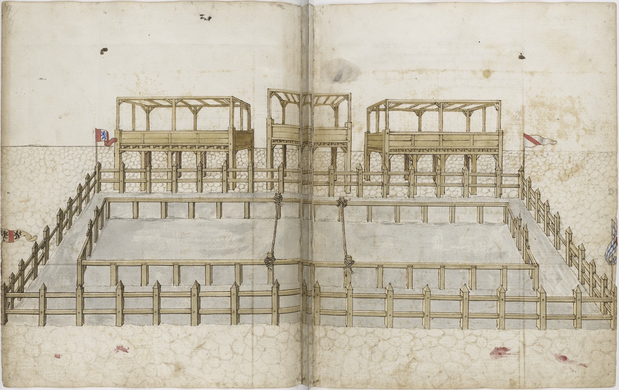 “Otros dos cadalsos, estaban en medio de la liza, uno frente al otro, y el uno era para los jueces y para el rey de armas, y farautes y trompetas y escribanos, y el otro para los generosos, famosos, honrados caballeros que viniesen a honrar el Honrado Paso… los otros dos cadalsos estaban más adelante para otras gentes y para los trompetas y oficiales de los caballeros y gentiles homes que al Paso viniesen”.