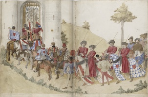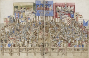 justas , danzas , misa , arquitectura efímera , música heráldica , pregón , bullicio en la calle , Suero de Quiñones , Juan II (rey de Castilla) , caballos , caballeros , trompetas , ministriles , tañedor de ajabeba (flauta morisca) , gentío , Dalmao (trompeta) , Petruco (trompeta) , Pericón (trompeta)