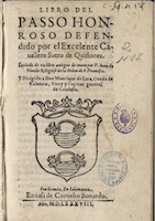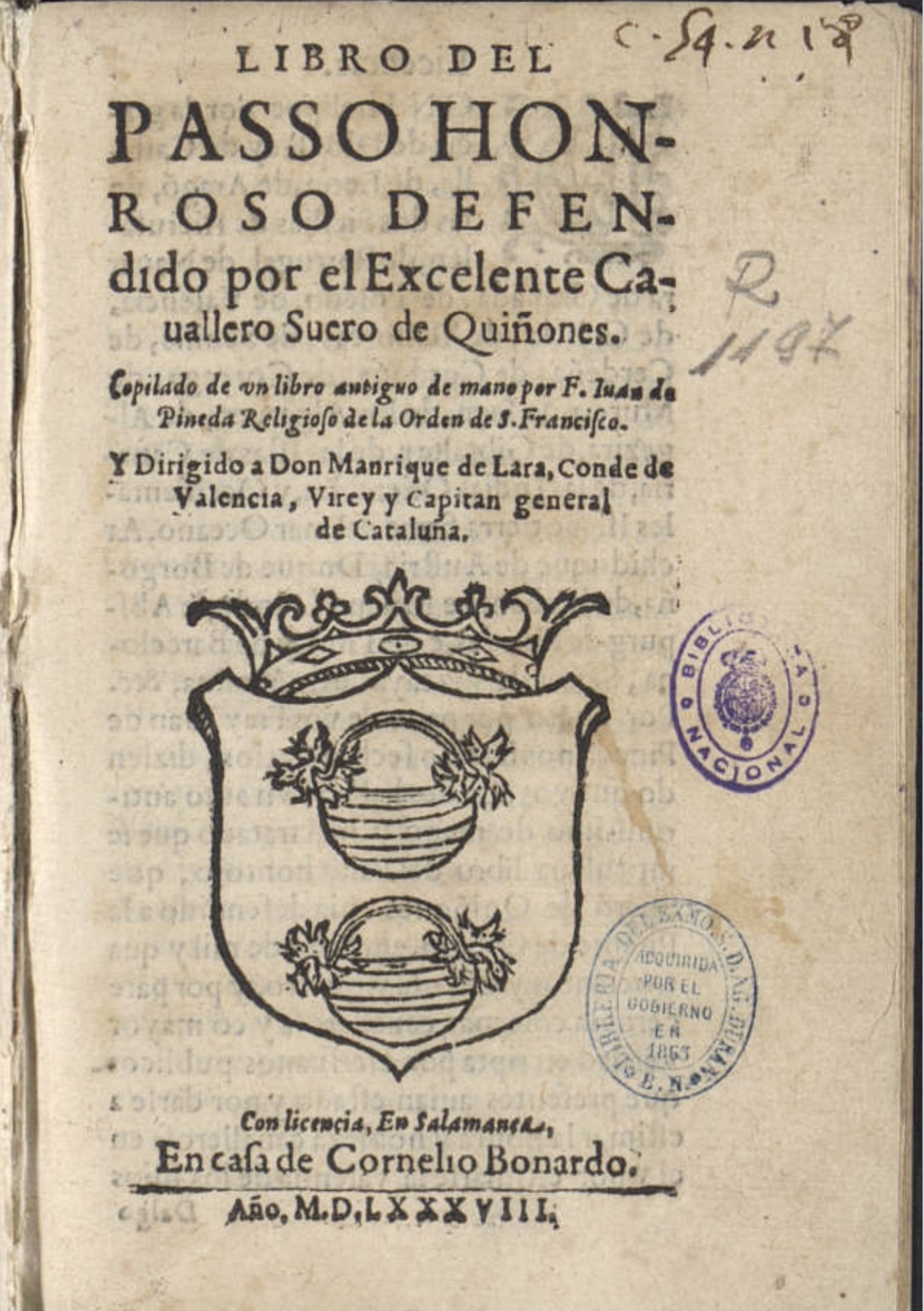 La crónica de este acontecimiento fue redactada por Pero Rodríguez de Lena, notario real, que fue testigo presencial de los acontecimientos y recogió estos hechos en su Libro del Paso Honroso defendido por el excelente caballero Suero de Quiñones. Esta obra fue publicada por el franciscano Juan de Pineda, en Salamanca, en 1588, que es la fuente que he usado para para extraer los principales elementos sónicos que se recogen en ella. Ya en la portada de su libro, Pineda señala que fue compilado “de un libro antiguo de mano”, refiriéndose igualmente a esta fuente la licencia de impresión concedida por el rey Felipe II: “que vos habíades hallado un auto antiquísimo de mano y maltratado que se intitulaba Libro del Paso Honroso”. En su inicio, se dice que el libro fue “abreviado” por Pineda, aunque, como veremos, al final del mismo, el franciscano reconoce que fue fiel a todo lo que en ese manuscrito se contenía.