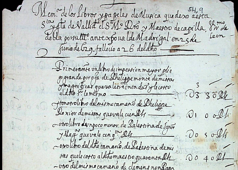 En la temprana Edad Moderna uno de los procedimientos que incrementaban los fondos musicales de las instituciones religiosas era la donación de libros y papeles de música por parte de particulares. Ello se hacía tanto con la intención de alcanzar a través de esa entrega las pertinentes contrapartidas espirituales como de cubrir cualquier tipo de “deuda” adquirida con la iglesia. Tales dádivas podían hacerse en vida, supuestos en los que solía entregarse un libro o un reducido número de ellos, seleccionados de conformidad con los usos de la institución destinataria; pero las cesiones más copiosas suelen tener lugar una vez fallecido el donante y quedaban reflejadas en alguna de sus cláusulas testamentarias. Un ejemplo de estas últimas lo constituye el legado que el maestro de capilla Jerónimo de León dejó a la catedral de Valladolid en junio de 1629. Comprendía 41 volúmenes de libros impresos (algunos encuadernados formando facticios, por lo que el número de colecciones total es de al menos 63); 4 o 5 volúmenes manuscritos; 6 tratados de teoría musical, así como “doce legajos de villancicos de todas fiestas que despacio se han de ver”; “un cartapacio de letras solas grande de a pliego” y cuatro papeles sueltos con música polifónica. La donación de este maestro de capilla aumentó significativamente los fondos musicales de la catedral vallisoletana, hasta el extremo de que aún hoy representan al menos el 60% de los fondos impresos conservados.