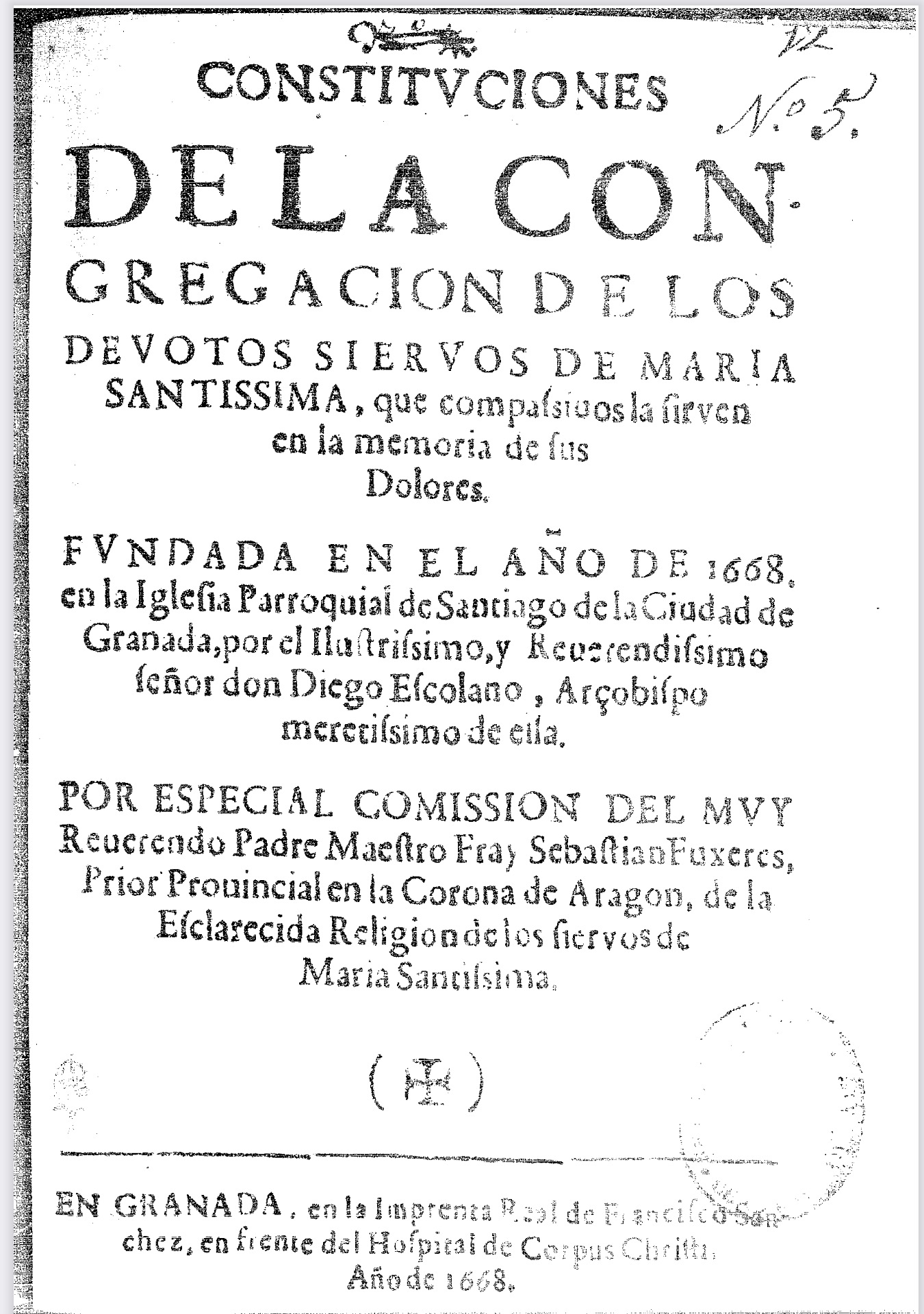 * Cofradía de la Orden Tercera de Siervos de Nuestra Señora de los Dolores. Esta cofradía fue fundada por el arzobispo Diego Escolano y Ledesma el 9 de diciembre de 1668: “por especial comisión de… fray Sebastián Fuxeres, prior provincial en la Corona de Aragón de la esclarecida religión de los siervos de María Santísima”. Escolano ya había fundado una cofradía de terciarios servitas en la iglesia de San Andrés de Segovia, durante su estancia como obispo de esa ciudad (1664-1668). La congregación granadina se estableció en la capilla de Nuestra Señora de las Tres Necesidades de la parroquia de Santiago.