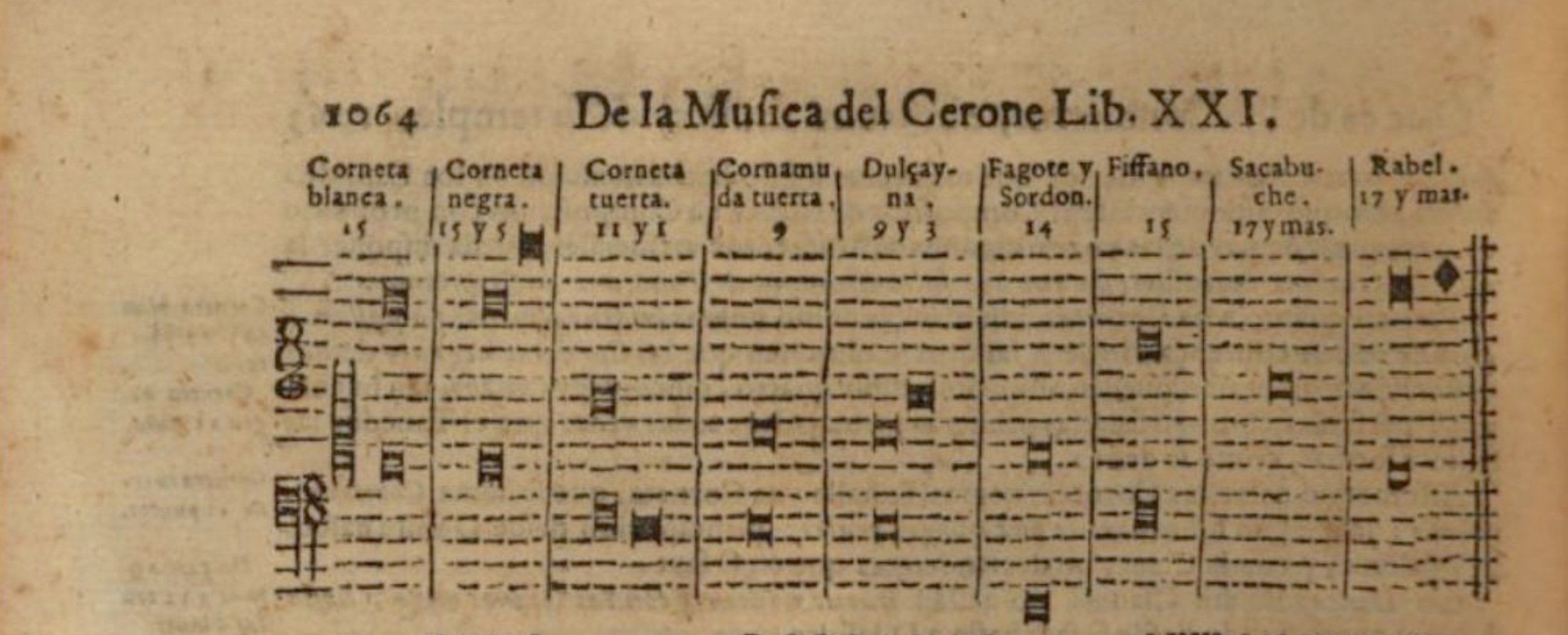 Con respecto a los instrumentos, como vemos, tenía dos chirimías, con sus cajas respectivas de protección. Son escasas las cajas de chirimías que se han conservado, tres de ellas en la catedral de Salamanca, una de tiple (restaurada), otra de tenor y la otra de bajo. En el caso de las cornetas, disponía, por un lado, de dos cornetas “tuertas”. Pedro Cerone, en El melopeo y maestro (libro XXI, capítulo XXIII, 1613), “Demostración universal de lo que suben y bajan los instrumentos musicales”, nos proporciona información suficiente para identificar este instrumento de forma precisa: