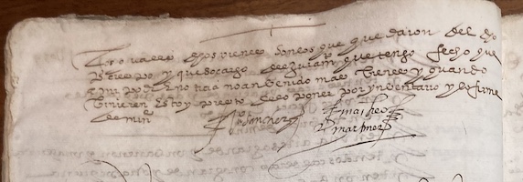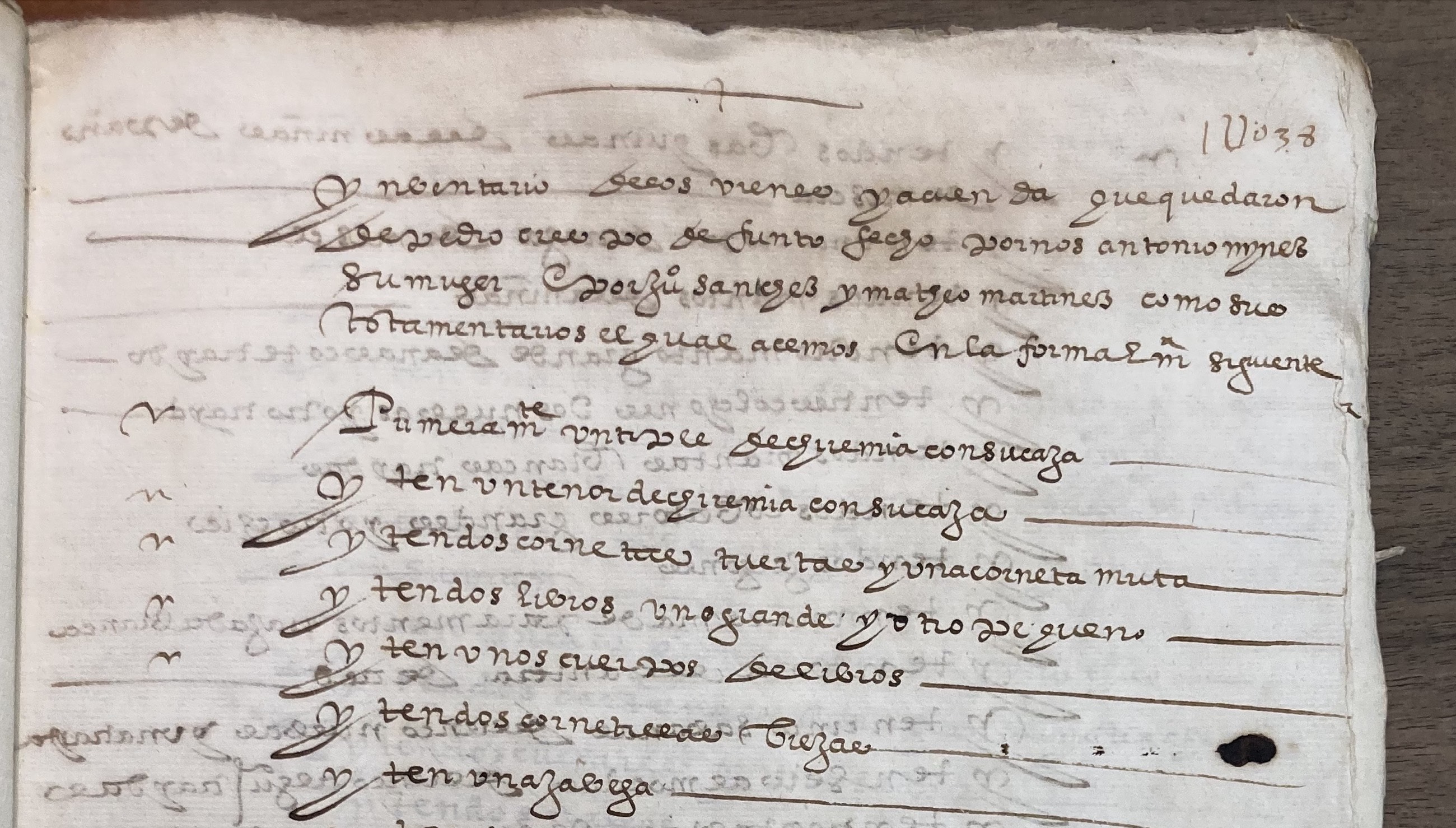 “Todos los acreedores y legatarios y fideicomisarios y otras cualesquier personas que han o pretendan algún dinero e acción de los bienes y hacienda que quedaron de Pedro Crespo, menestril, sepan que sus testamentarios quieren hacer inventario de sus bienes. Por tanto, todas las personas que le quisieren ver hacer váyanse a las casas de su morada que son en la placeta de la Frenería desta villa a las dos horas después del medio día que allí le verán comenzar, continuar y acabar dentro del término de la ley. Mándase pregonar porque venga a noticia de todos”.