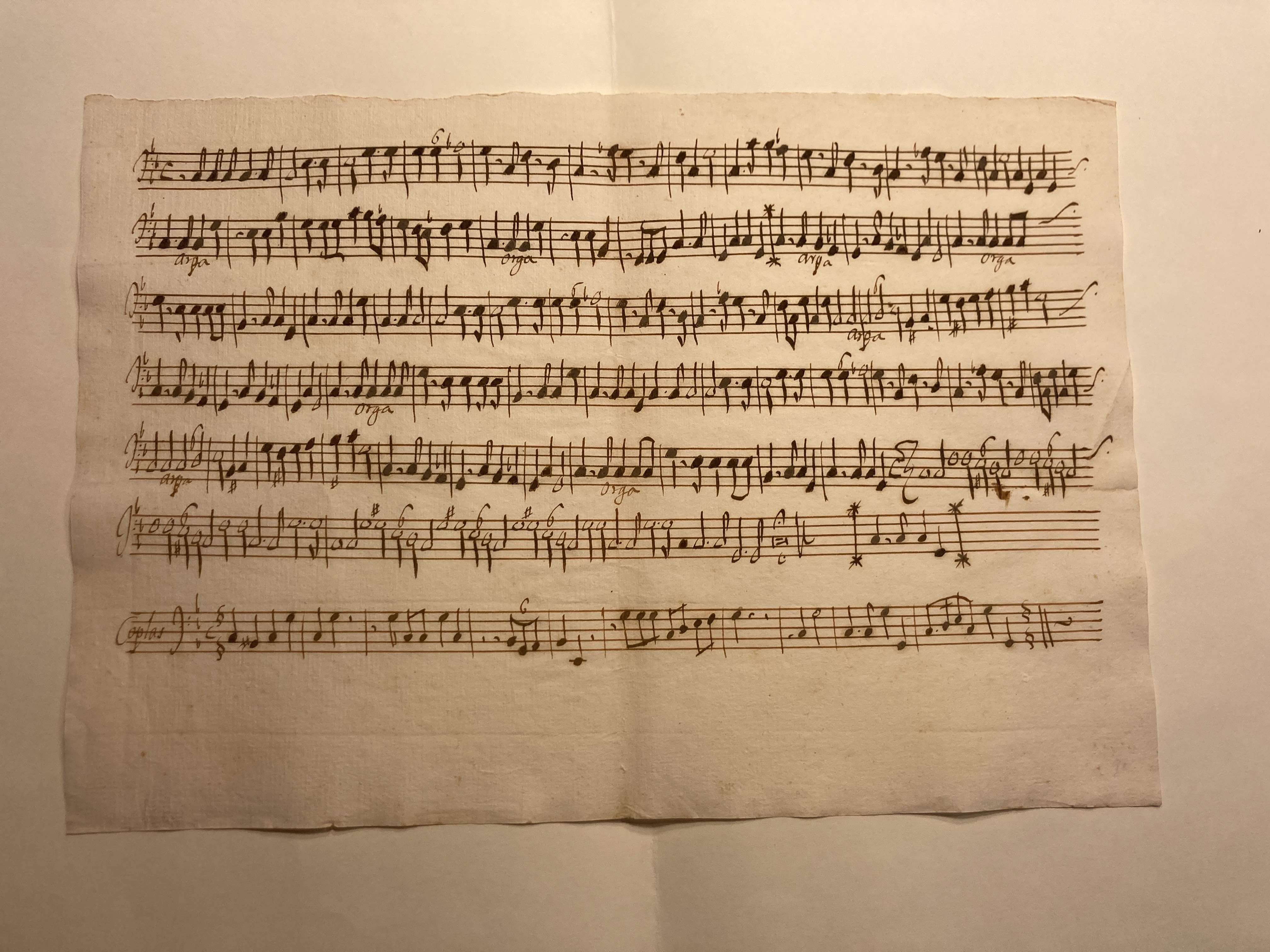 Primer coro: Tiple; Segundo Coro: Tiple, Alto, Tenor, Bajete; Tercer coro: Chirimía tiple; Cuarto coro: Tiple, Alto, Tenor, Bajo [instrumental: solo íncipit literario]. Dos copias del “Acompañamiento” cifrado, una de ellas para el órgano.