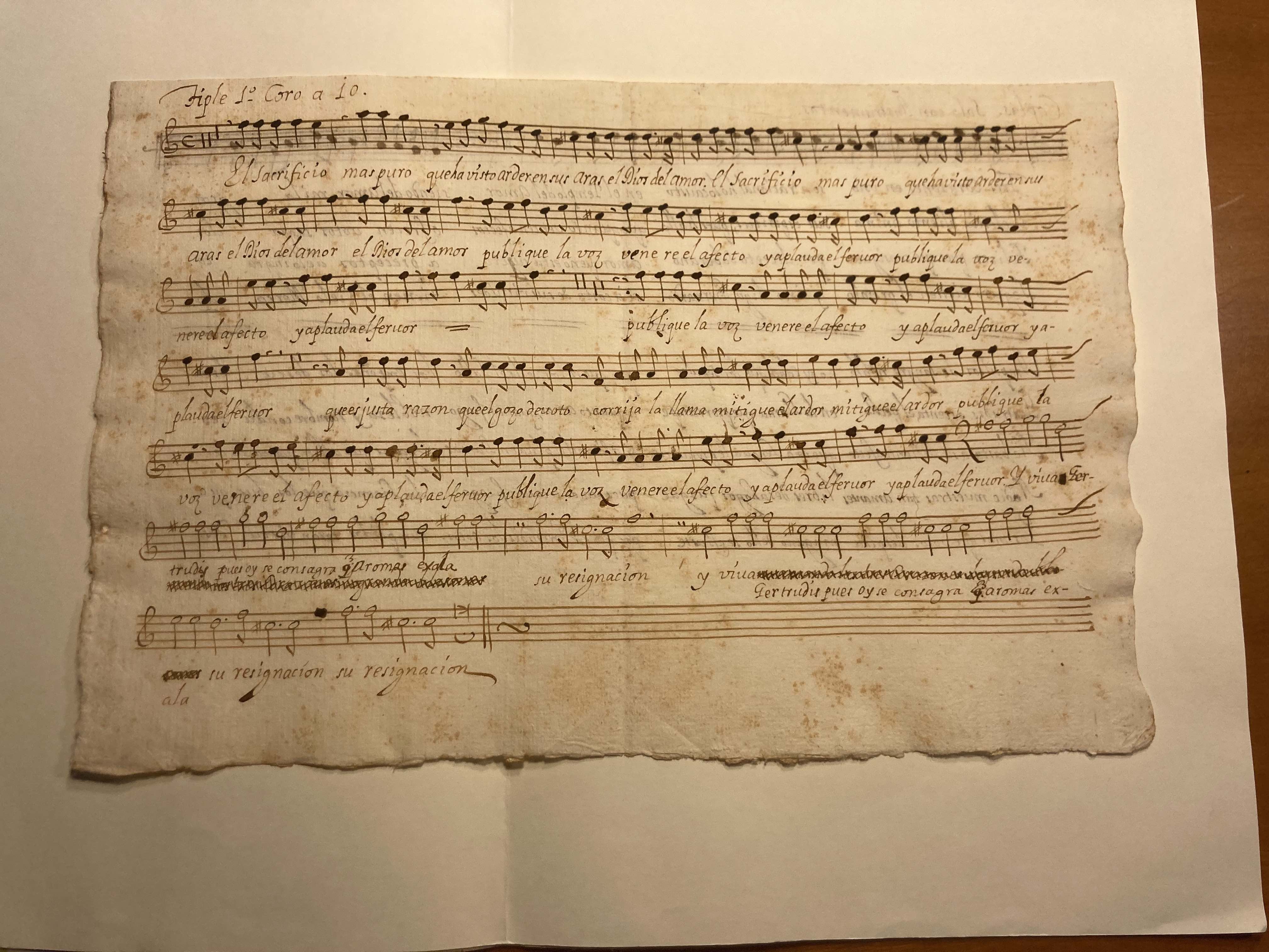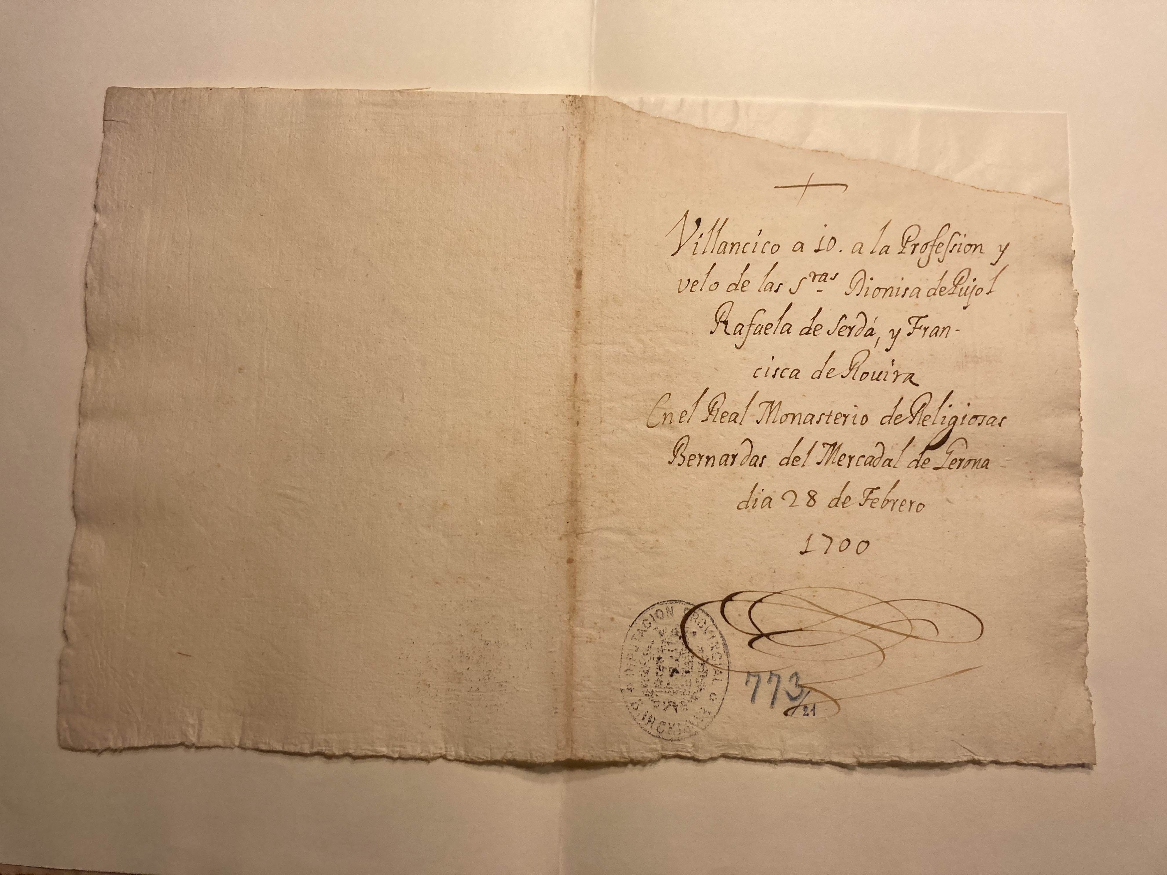* “Villancico a 10 a la profesión y velo de las señoras Dionisa de Pujol, Rafaela de Serda y Francisca de Rovira en el real monasterio de religiosas bernardas del Mercadal de Gerona. Día 28 de febrero 1700”.
