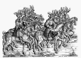 Entretanto, el Concejo se preocupaba por “guarnecer y encolar los seis atabales de esta ciudad”, abonando tres mil maravedíes al cedacero Diego Merino el 13 de Julio de 1571. Es fácil deducir que los seis atabales propiedad de la ciudad de Écija corresponden a tres pares de instrumentos montados en sendas cabalgaduras, a los que acompañaban las trompetas que, como ya especificara Luis de Vargas, podían venir “a caballo o a pie”.