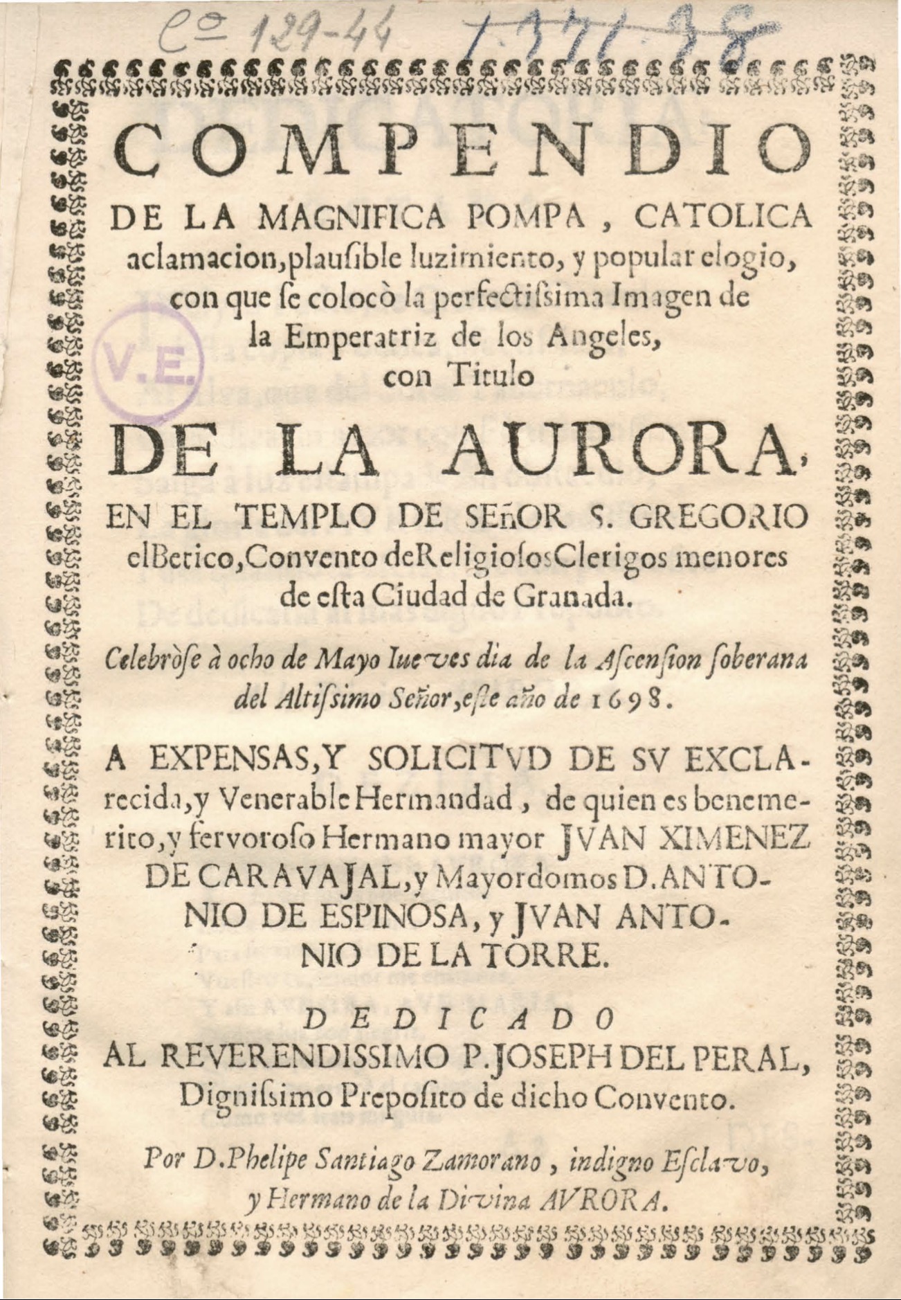 procesión , procesión de traslado de imágenes , tañido de campanas , arquitectura efímera , salva de mosquetes , bullicio en la calle , sermón , elementos odoríferos , cofradía de Nuestra Señora de la Aurora , Orden Regular de Clérigos Menores , Felipe Santiago Zamorano , campanero , clarinero , caja , nobleza , cofrades , niños , capilla de música