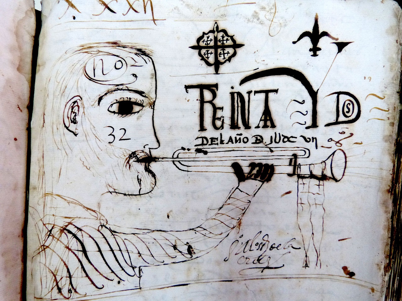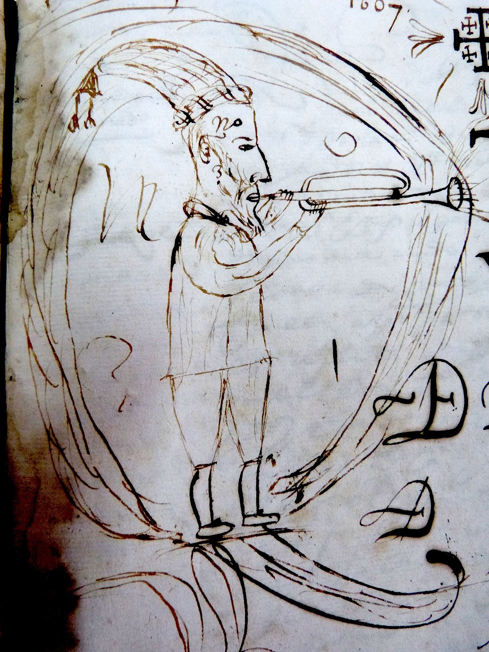 Con motivo de la proclamación del rey Felipe III en 1598, el acta capitular relata que los regidores y jurados del cabildo venían acompañados en su recorrido por “los soldados de la milicia della con sus arcabuces y cajas, y los ministriles y atabales”. En el siglo XVI no resulta extraño intercambiar la denominación de trompeta con la de ministril.En 1621, para la proclamación del rey Felipe IV, el corregidor y los miembros del Ayuntamiento se dirigieron a la casa del alférez mayor, que custodiaba el pendón, para iniciar la comitiva poniendo “el dicho corregidor a el dicho alférez mayor en medio de sí y de su alcalde mayor, con música de chirimías, bastardillas y atabales, y en forma de cabildo, como habían venido, fueron todos juntos acompañando el dicho pendón”. En el Renacimiento se distinguían principalmente dos tipos de trompetas: la trompeta natural o italiana -de forma recta, heredera de los añafiles medievales, con un registro agudo- y la trompeta bastarda o española –instrumento cromático de tesitura intermedia en forma de S-, pero no están claras sus diferencias y apenas queda testimonio de cómo eran. En Carmona se han conservado, excepcionalmente, algunas referencias iconográficas coetáneas de lo que podría ser la representación de una trompeta bastarda (“bastardillas”). Se trata de dos dibujos que, a modo de pasatiempo, realizó en 1607 el escribano Alonso Sánchez de la Cruz en las portadas de algunos libros de protocolos. En el primero de ellos se juega con la imagen de un trompetista, ataviado con un gorro, dentro de la letra “Q” para componer un jeroglífico en relación con el número correspondiente del libro de protocolos: “¿Qué toca? El nº 31”. El segundo dibujo aparece en el libro consecutivo y representa también a un músico tocando una trompeta adornada con un banderín: “Toca el nº 32”.