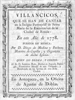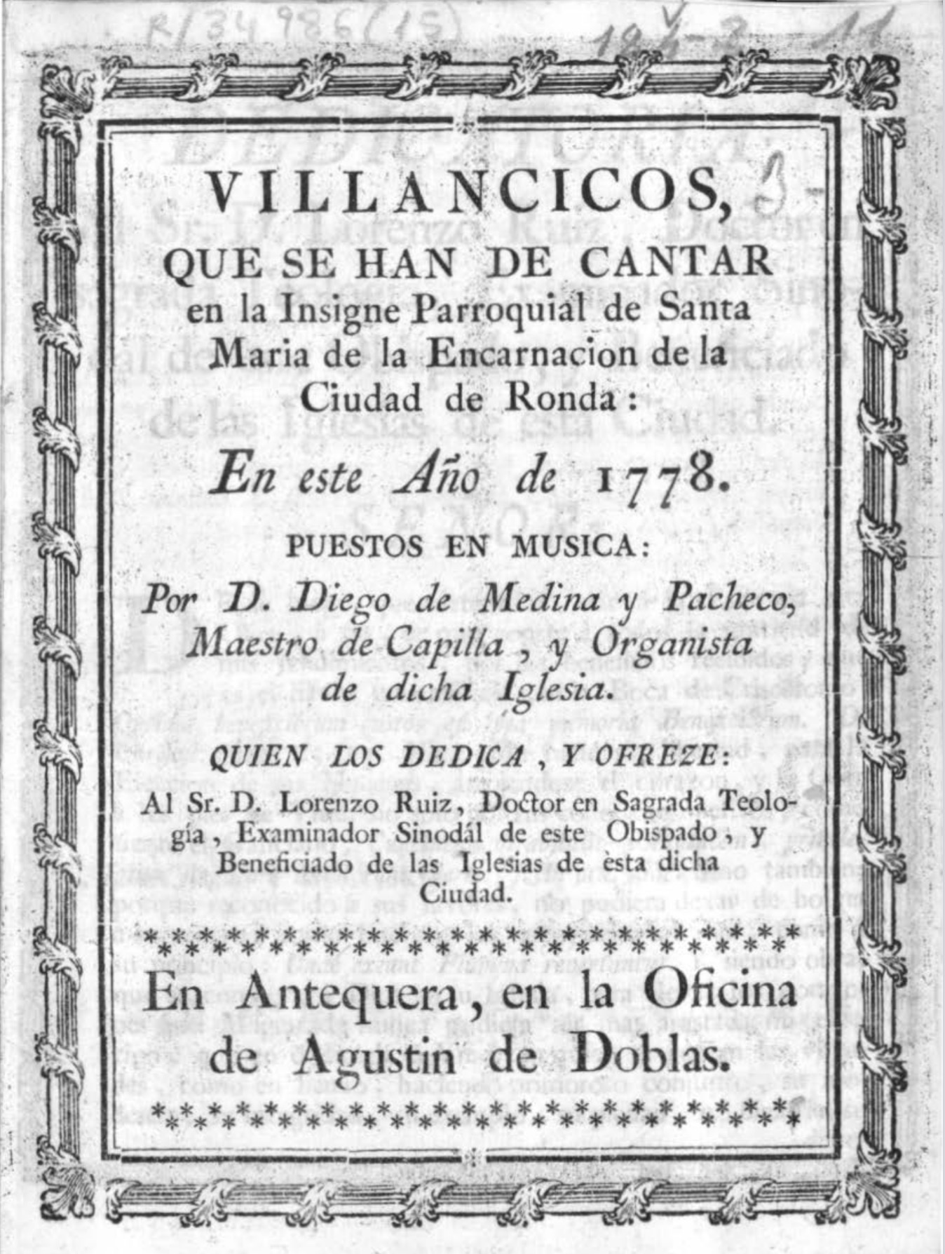 * Villancicos que se han de cantar en la ... Parroquial de Santa María de la Encarnación de la ciudad de Ronda, en este año de 1778, puestos en música por D. Diego de Medina y Pacheco, Maestro de Capilla y Organista de dicha Iglesia, quien los dedica ... al Sr. D. Lorenzo Ruiz, Doctor en Sagrada Teología… (Antequera: Agustín de Doblas, 1778).