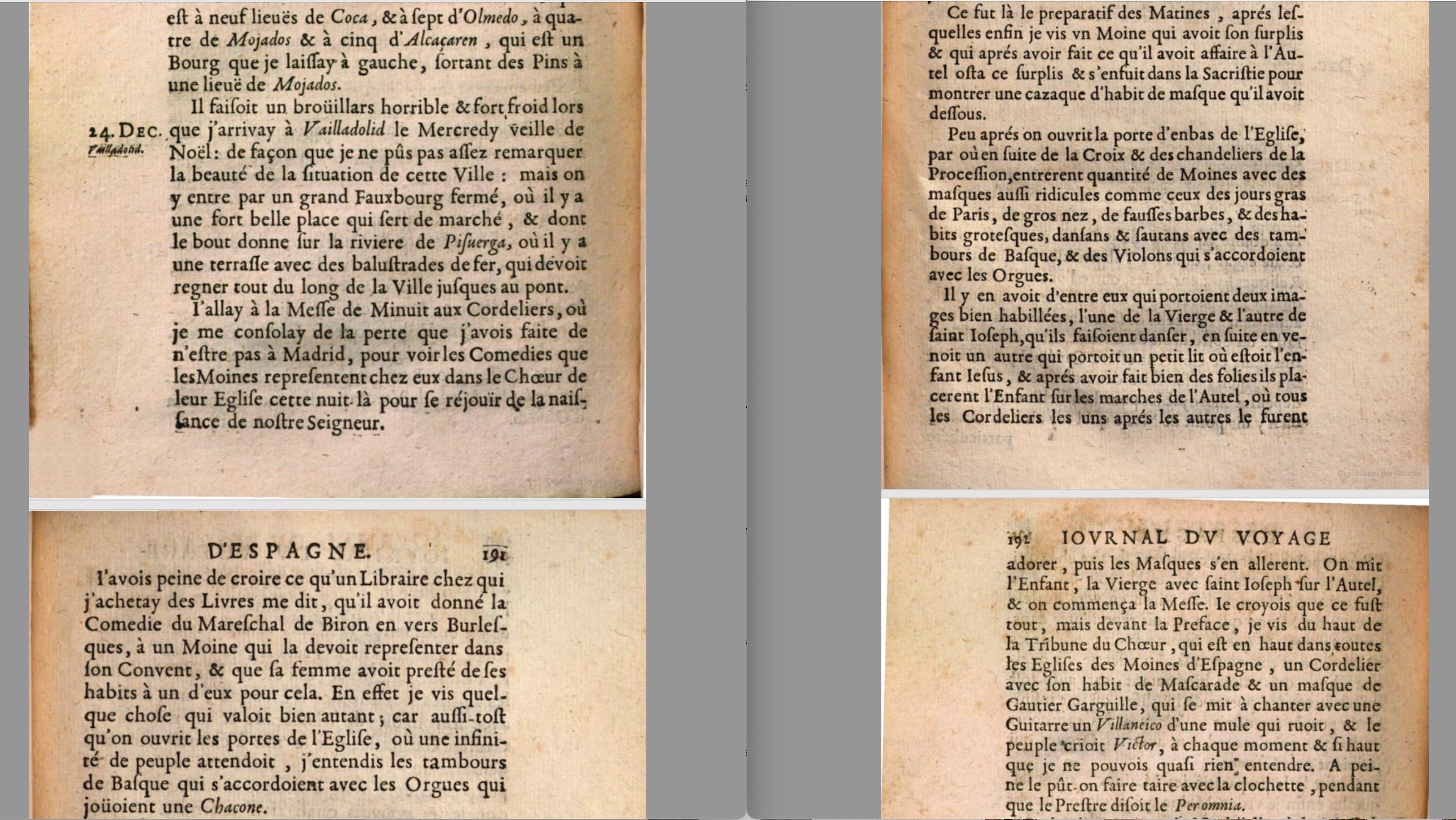 Bertaut llegó a Valladolid el miércoles 24 de diciembre de 1559, con una densa niebla y un frío intenso (“il faisoit un broüillars horrible & fort froid”). Dice que para “consolarse” de no estar en Madrid y poder asistir a las comedias que los franciscanos representaban en el coro de su iglesia conventual con las que se regocijaban por el nacimiento de Jesús, fue a la misa del gallo (“de Minuit”) que los monjes de esta orden (“les Cordeliers”) oficiaban en su convento vallisoletano. Cuenta que un librero al que había comprado unos libros, posiblemente en Madrid, le dijo que había dado un ejemplar de La comedia burlesca del mariscal de Virón a un monje, ¿franciscano?, para representarla en su convento y que su mujer le había prestado alguno de sus vestidos a otro de ellos para esa representación.
