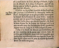 maitines de la fiesta de Navidad , misa del Gallo , villancicos de Navidad , chacona (baile) , procesión , François Bertaut de Fréauville (diplomático, escritor) , Orden de los franciscanos descalzos , gentío , organista , violinista , tañedor de pandereta