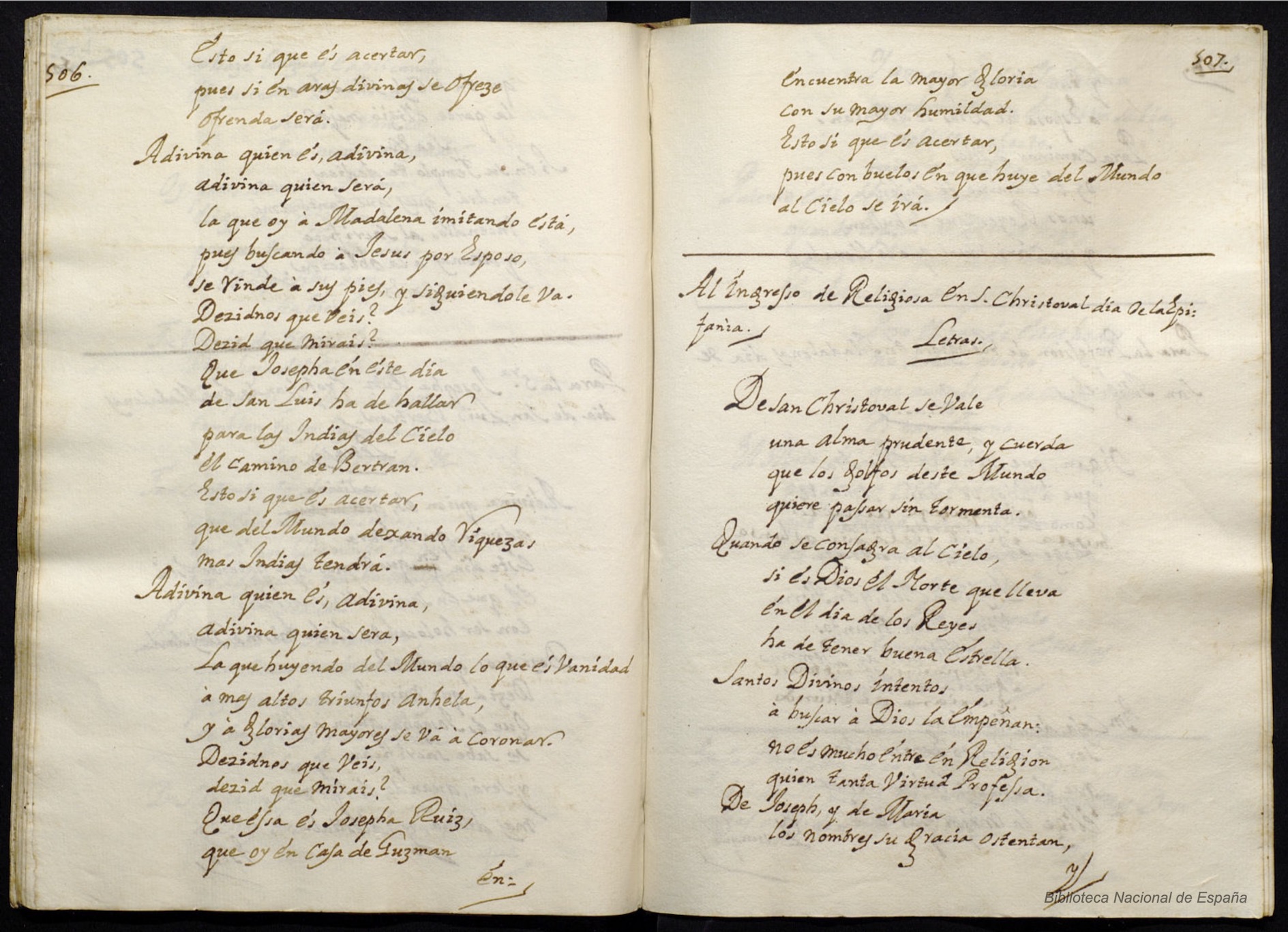 * Pp. 507-508. Villancico sin fecha y sin especificación de la religiosa que profesó: “Al ingreso de religiosa en San Cristóbal, día de la Epifanía”, con el íncipit:
