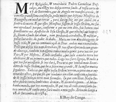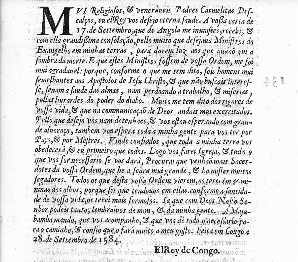 - La copia impresa de una carta escrita por fray Diego del Santísimo Sacramento desde la capital del reino del Congo, el 14 de diciembre de 1584. Biblioteca Nacional del España, mss. 2711, fols. 131r [112r]-132r [113r].