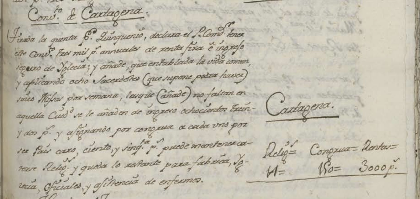 Conocemos los detalles de la visita que realizó Momoitio e Iturriaga, residente en Quito, al convento mercedario de Cartagena de Indias a través de un informe dirigido al virrey y capitán general de Santa Fe. En él, se incluyen los decretos que se mandó observar a todos los conventos mercedarios visitados y un resumen de los religiosos, congrua (renta mínima que debía percibir cada uno de los frailes para poder mantenerse) y renta de cada uno de ellos. Para el caso del convento de Cartagena de Indias, es el siguiente (véase recurso):
