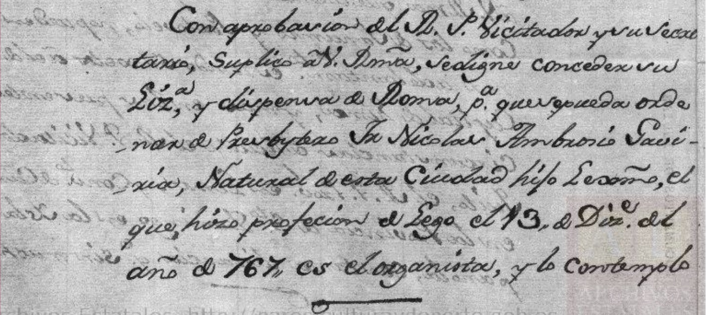 “Con aprobación del reverendo padre visitador y su secretario, suplico a Vuestra Reverendísima se digne conceder su licencia y dispensa de Roma para que se pueda ordenar de presbítero fray Nicolás Ambrosio Gaviria, natural de esta ciudad, hijo legítimo, el que hizo profesión de lego el 13 de diciembre del año 1767, es el organista, y lo contemplo muy útil para el coro, por lo que estimaré en sumo agrado le conceda Vuestra Reverendísima su bendición y licencia. El costo que pueda ocasionar la dispensa librará a Madrid don Francisco Rodríguez Morzo”.
