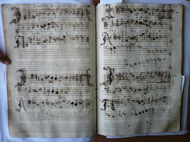 * Papeles de música, 451. Salmos de canto de órgano que pertenecen a la capilla, para Vísperas del Santísimo, de la Virgen y para primeras de Mártires y Confesores. Es un juego de cuatro libretes manuscritos copiados en papel (SATB). En el sobre que los contiene, a bolígrafo, su copia está atribuida a “Quiros”. Se trata del ya citado maestro de capilla de la catedral guatemalteca Manuel José de Quirós (¿?-†1765). En los libretes se anotó la inscripción: “Vísperas [voz correspondiente] a 4: copiados aún para los no latinos”.