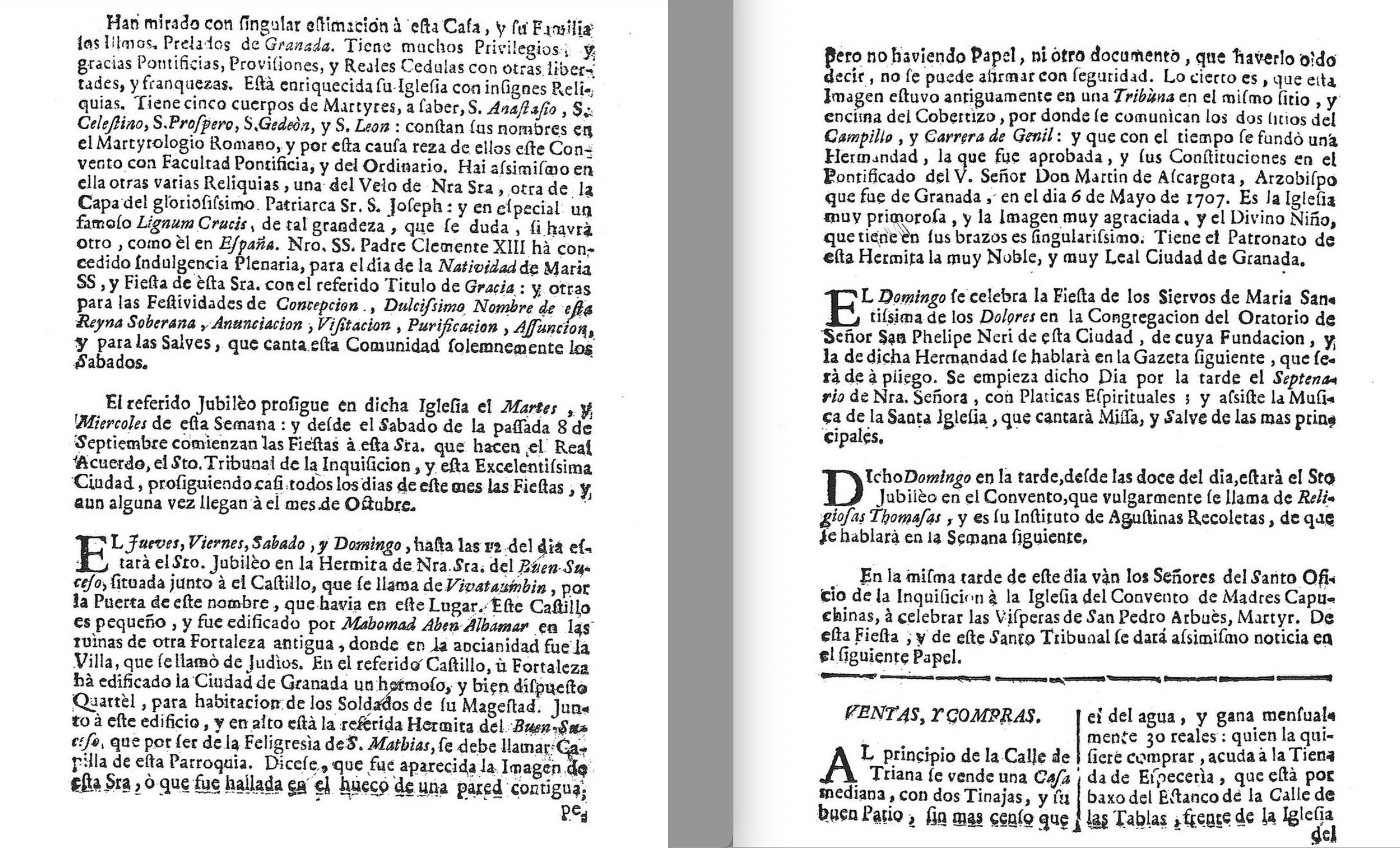 “Esta imagen estuvo antiguamente en una tribuna en el mismo sitio y encima del cobertizo por donde se comunican los dos sitios del Campillo y Carrera del Genil y con el tiempo se fundó una hermandad que fue aprobada y sus Constituciones en el pontificado del V. Señor Don Martín de Ascargota, arzobispo que fue de Granada, en el día 6 de mayo de 1707. Es la iglesia muy primorosa y la imagen agraciada y el Divino Niño que tiene en sus manos singularísimo. Tiene el patronato de la ermita la muy noble y muy leal ciudad de Granada”.
