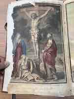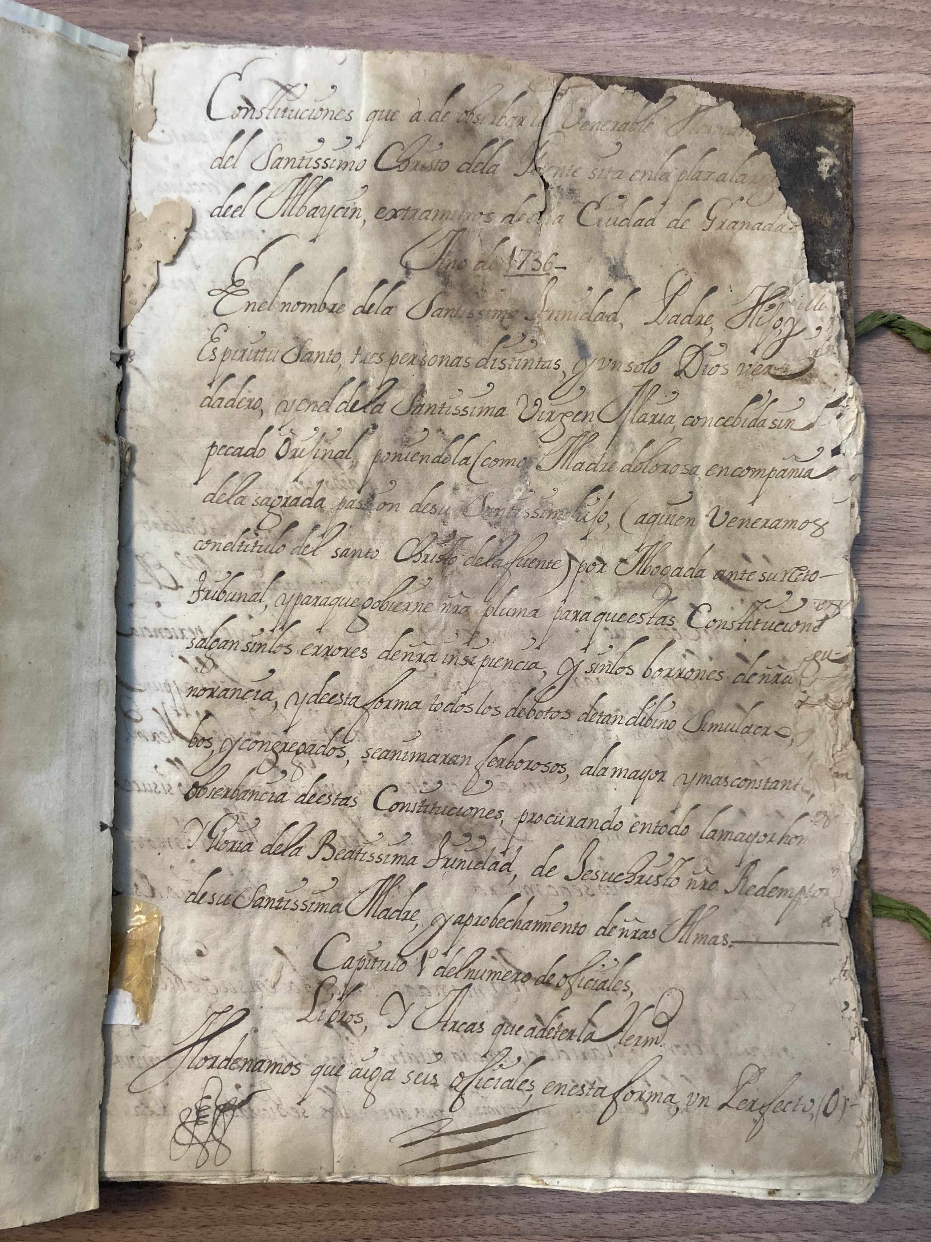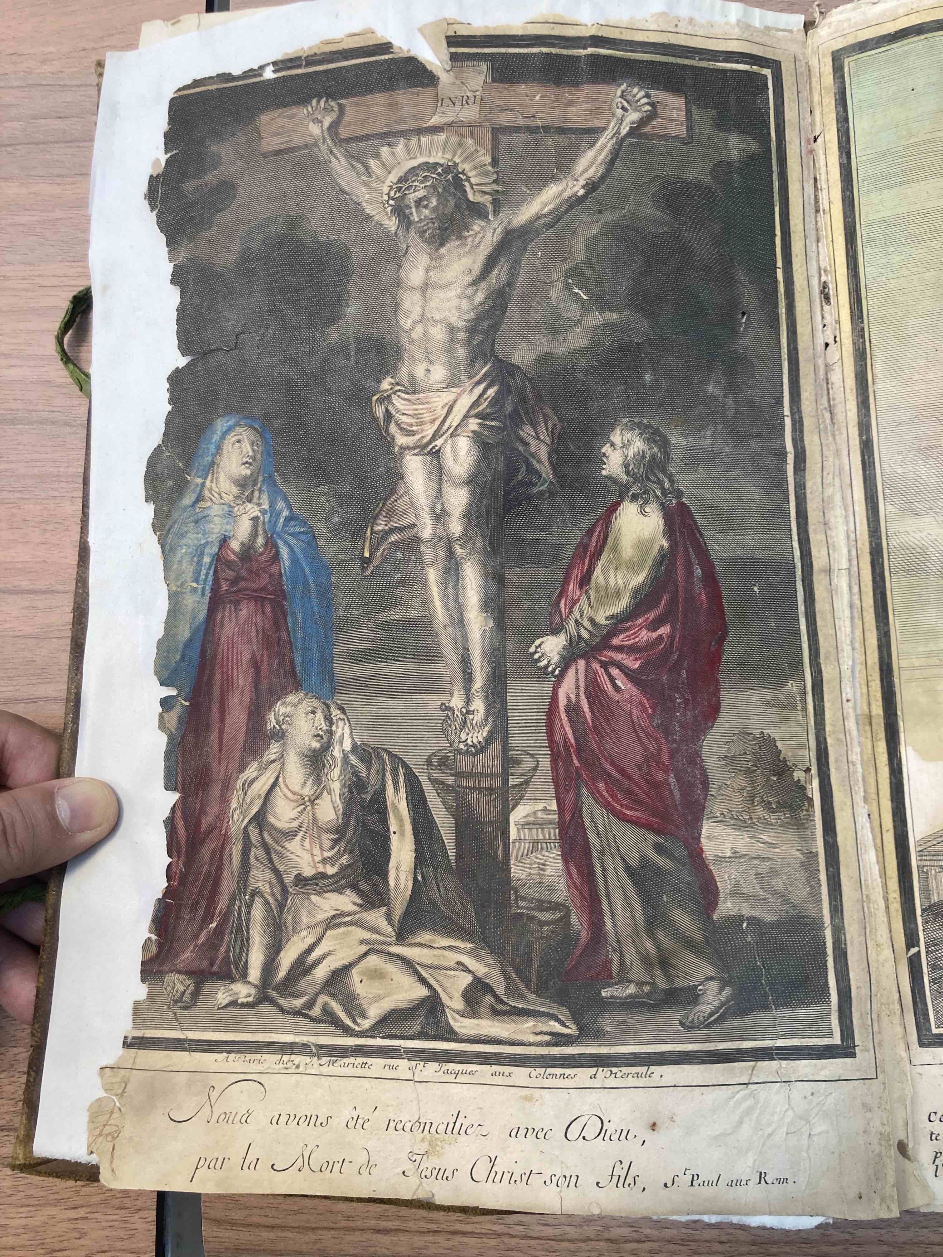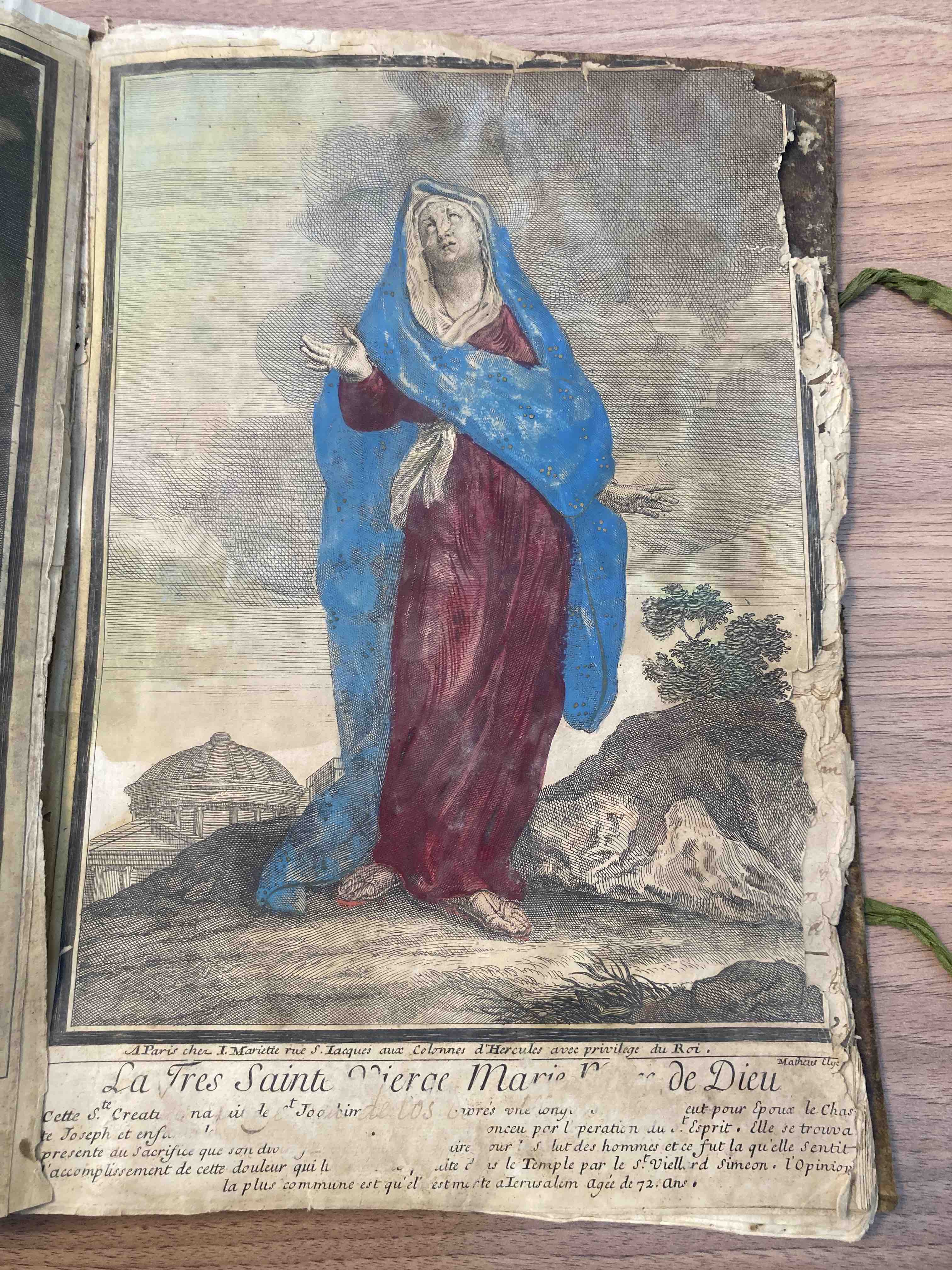 El libro de las Constituciones de esta hermandad se encuentra en un precario estado de conservación. Se inicia con dos grabados franceses de Jean Mariette (1660-1741), grabador francés que había abierto su taller en la rue Saint Jacques (actualmente n.º 67) de París en 1734. Tenía como emblema: “aux Colonnes d’Hercule”. El primero representa la Crucifixión de Jesús y el segundo “la tres sainte Vierge Marie Mère de Dieu”, ambos han sido parcialmente coloreados (ver recursos).