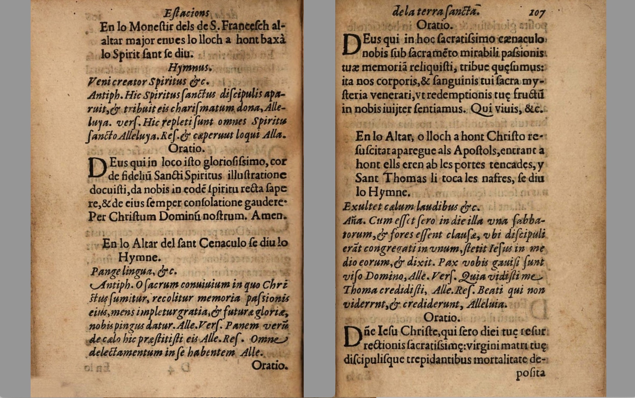 viaje , Miquel Matas. La devota peregrinació de la Terra Sancta , Itinerario del viaje a Jerusalén de Francisco Guerrero , Veni creator spiritus (himno) , Hic Spiritus Sanctus discipulis apparuit (antiphon) , Deus, qui in loco isto gloriosissimo corda fidelium (oratio) , Pange lingua (himno) , O sacrum convivium in quo Christus sumitur (antiphon) , Deus qui in hoc sacratissimo cenaculo (oratio) , Exultet caelum laudibus (himno) , Cum esset [ergo] sero in die (antiphon) , Domine Jesu Christe qui sero diei tue resurrectionis sacratissime (oratio) , Pater Noster , Ave Maria , Petrus quidem servabatur in carcere (antiphon) , Deus qui beatum Petrum Apostolorum a vinculis absolutum (oratio) , cartografiando Francisco Guerrero , Miquel Matas (sacerdote) , frailes franciscanos , Orden de los franciscanos descalzos