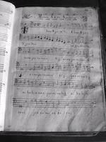 - Fols. 69v-77r. In exitu Israel de Aegypto. [Francisco Guerrero] Estaba atribuido a Lobo, pero sobre el nombre hay un papel pegado para taparlo. Es el salmo publicado en el Liber vesperarum (Roma 1584), fols. 12v-18r. Presenta pequeñas variantes rítmicas con respecto al impreso y no copia las accidentales, todo lo cual apunta a una transmisión a partir de otro manuscrito.