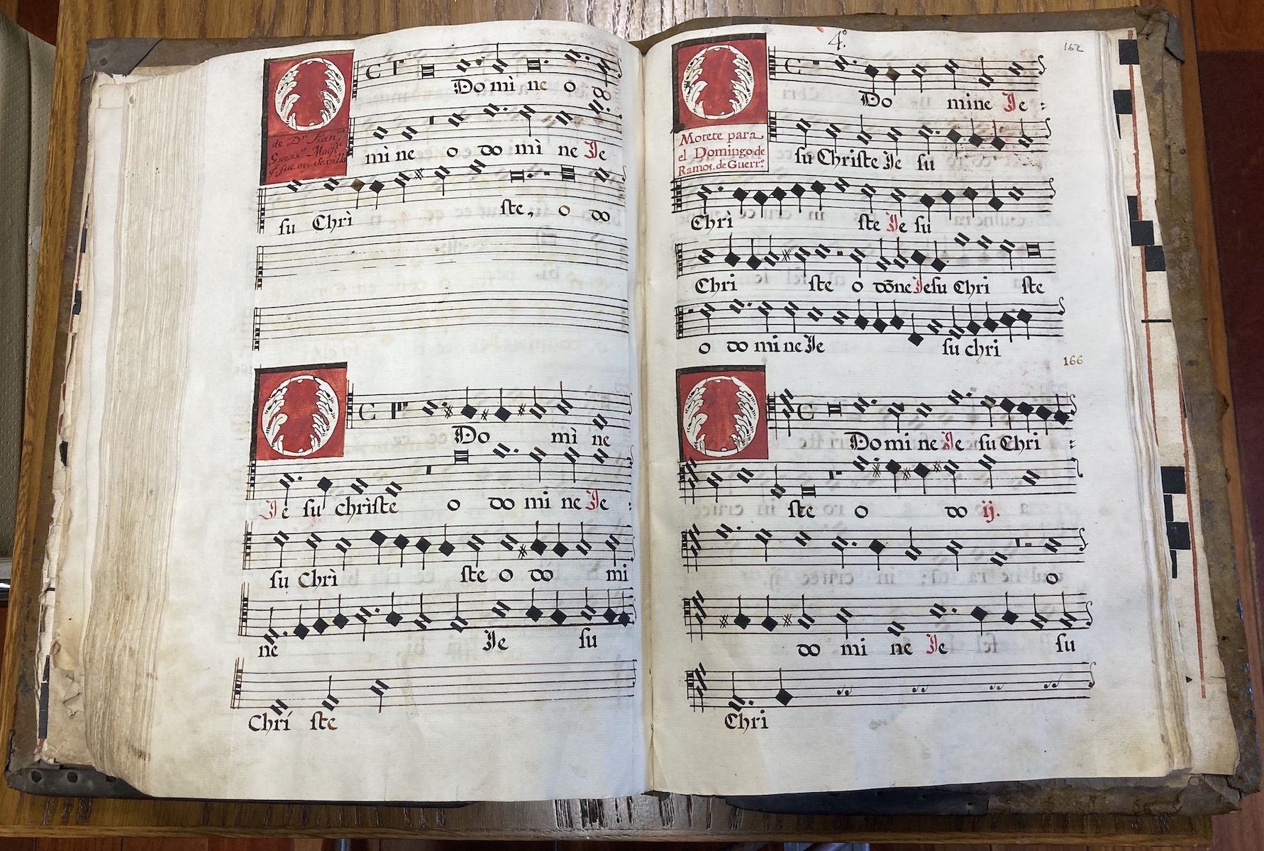 - Fols. 161v-165r. O Domine Iesu Christe. “De don Francisco Guerrero, maestro que fue en Sevilla (fol. 161v) / “Motete para el domingo de Ramos, de Guerrero (fol. 162r) [1570].