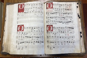 * Libro de polifonía nº 7 [Catálogo de López Calo, nº 1]. Escrito en papel y encuadernado en tablas, forradas de cuero y con refuerzos metalicos. Mide 49,5 x 37 cm.