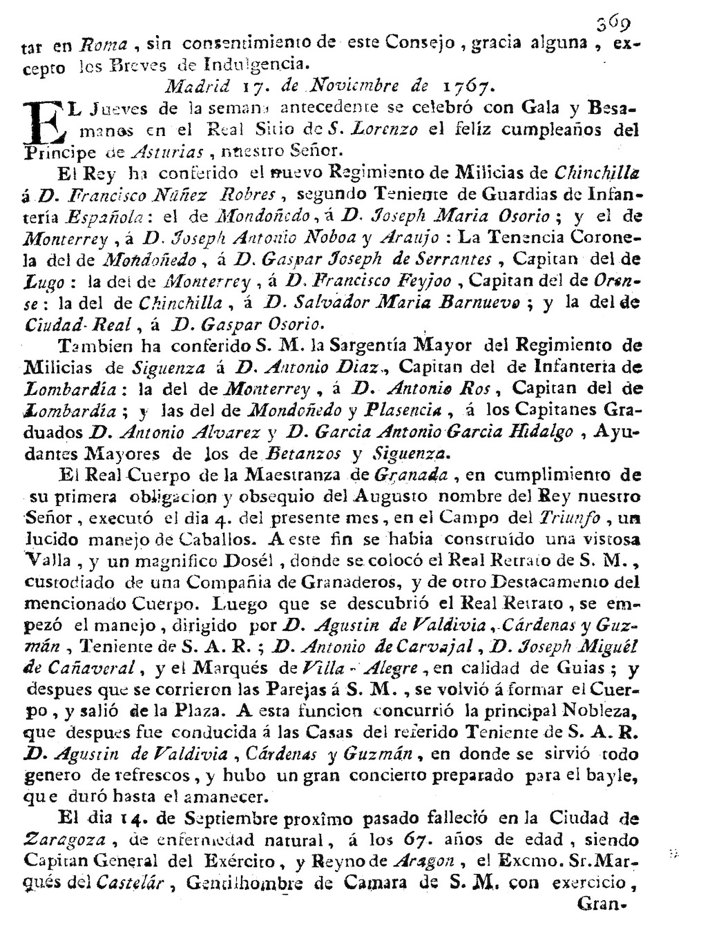 Todo apunta a que, para celebrar ese nombramiento, la corporación organizara, justo al día siguiente, un espectáculo ecuestre en homenaje al rey Carlos III, del que se hizo eco la prensa madrileña, con un texto idéntico (véase recurso), publicado en las noticias de noviembre de 1767 en El Mercurio Histórico y Político (Madrid: Imprenta de la Gazeta, 1768, pp. 251-252) y en el n.º 46 de la Gazeta de Madrid del martes 17 de noviembre de 1767 (Madrid: Francisco Manuel de Mena, 1767, p. 369).