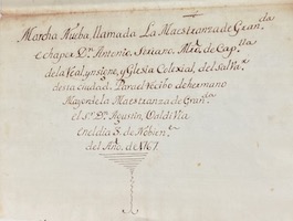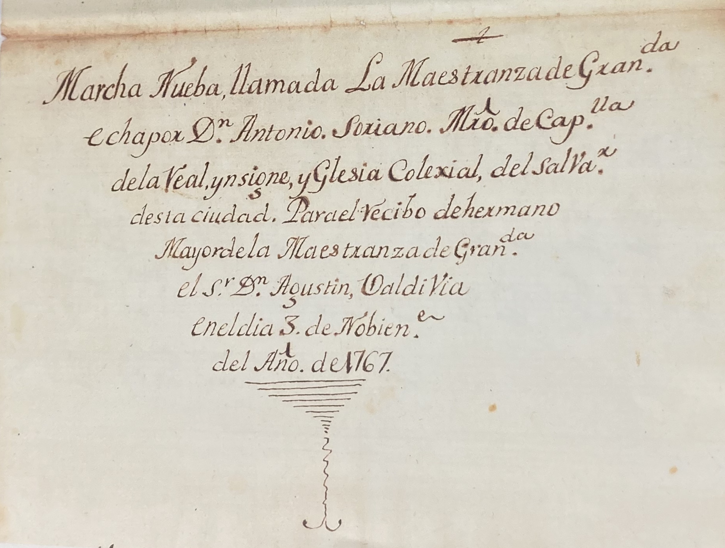 La “Marcha Nueva, llamada La Maestranza de Granada” nos acerca a la producción musical, ajena a la esfera sacra, de Antonio Soriano, maestro de capilla de la colegiata del Salvador desde el 25 de septiembre de 1761 hasta su fallecimiento el 25 de junio de 1780. La obra está escrita en Re Mayor y conserva los papeles para la siguiente plantilla instrumental: Oboe 1, Oboe 2, Clarín 1, Clarín 2, Trompa 1, Trompa 2 y Bajo.