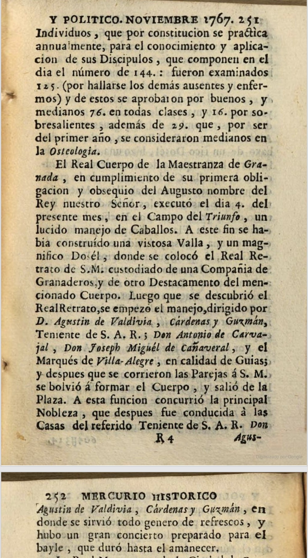 “Se empezó el manejo, dirigido por D. Agustín de Valdivia Cárdenas y Guzmán, teniente de S. A. R.; don Antonio de Carvajal, don José Miguel de Cañaveral y el [IV] Marqués de Villa Alegre [Antonio Porcel y Manrique de Arana], en calidad de guías. Y después que se corrieron parejas a S. M. se volvió a formar cuerpo y salió de la plaza”.