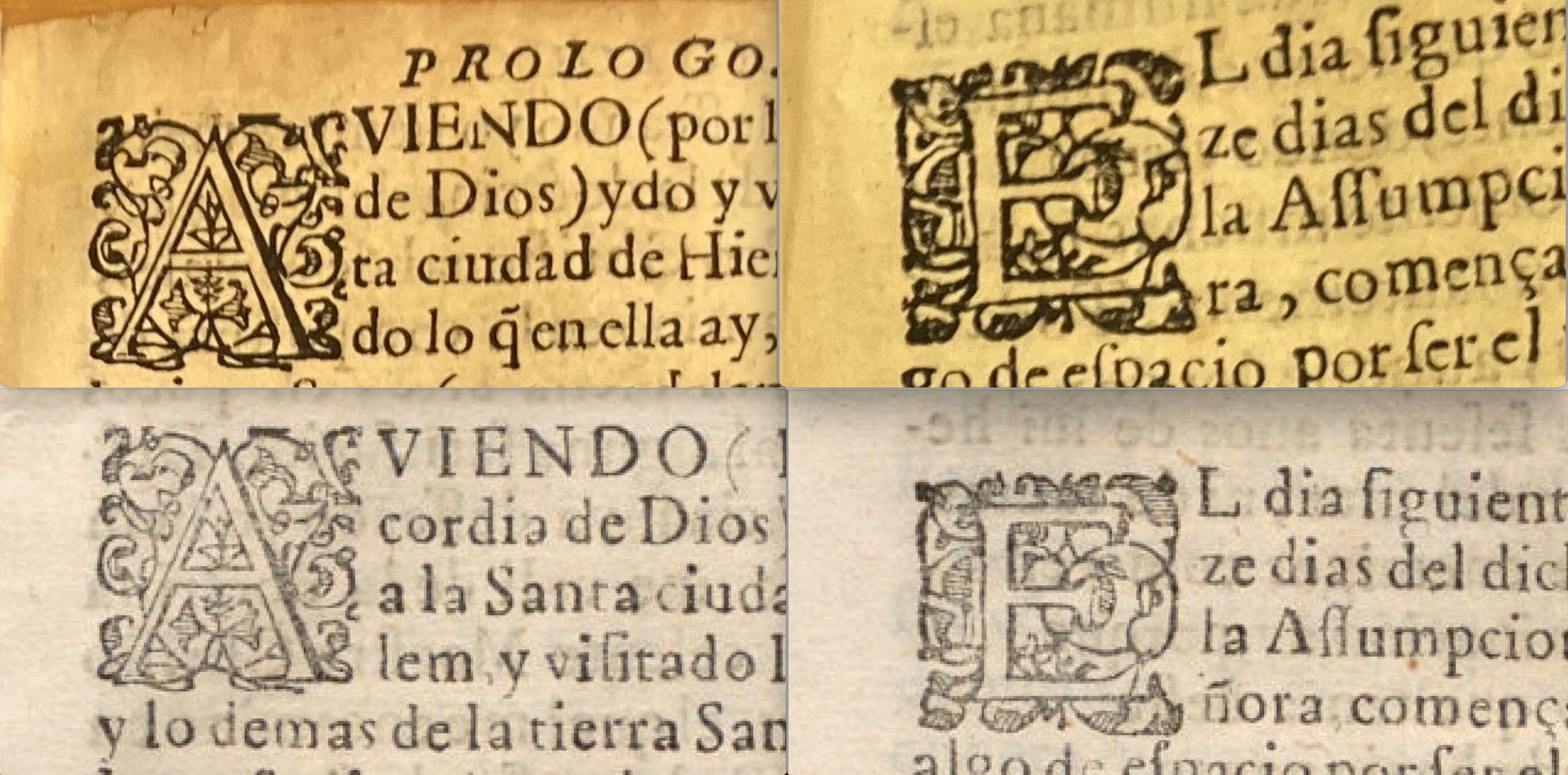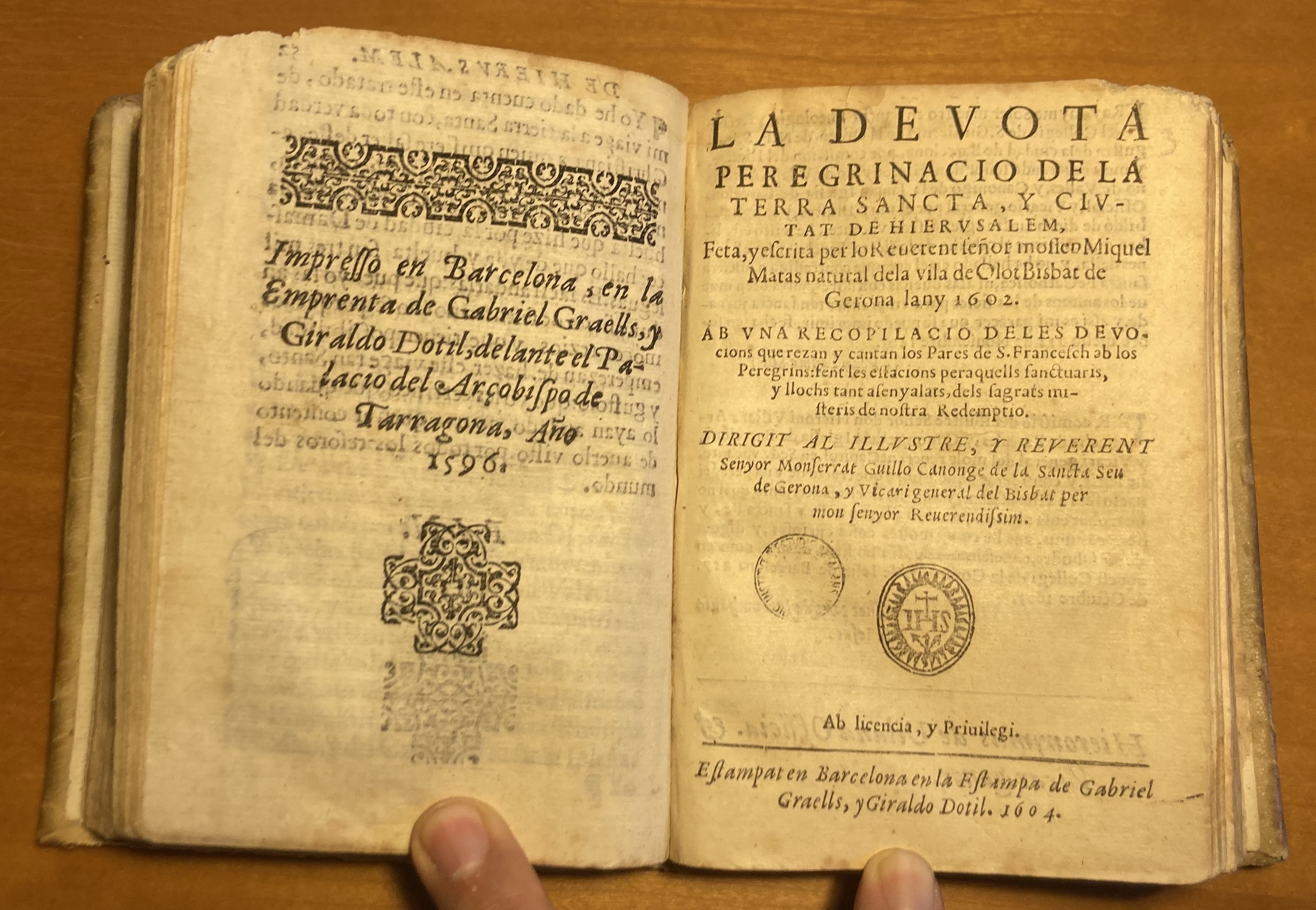 En 1596, se publicaba la segunda edición barcelonesa de El viage de Hierusalem de Francisco Guerrero por los impresores Gabriel Graells y Gerard Dotil, “a costa de”Arnau Garrich, librero. Todo apunta a que la asociación de Graells y Dotil debió efectuarse en torno a 1596, ya que los primeros libros salidos de sus prensas están fechados ese año. Un primer acercamiento a esta edición pone de manifiesto que los impresores usaron el monograma de la compañía de Jesús y las capitales de la edición impresa en Barcelona en 1594 por Paula Baresson, Mauricio Anglada y Joan Torres (véase recurso), por lo que es más que probable que adquirieran utensilios y materiales de la imprenta de Noel Baresson antes de la compra que efectuaron en 1601, igualmente a sus herederos, documentada por José María Madurell Marimón. La licencia y la aprobación, fechada esta última el 13 de noviembre de 1594, son también los de esa primera edición barcelonesa. En la edición de 1596, además, se incorporó un soneto dedicado “A Sant Josef esposo de nuestra Señora”, una de las principales devociones de la Compañía de Jesús que junto al monograma citado de su portada apuntan a los jesuitas barceloneses como sus patrocinadores.