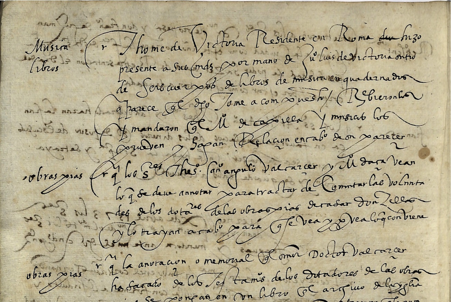 "Thomé de Victoria residente en Roma [tachado: du] hizo presente a sus mercedes por mano de Juan Luis de Victoria su tío de seis cuerpos de libros de música enquadernados que parece quel dicho Tomé a compuesto. Rezibiéronlos y mandaron quel maestro de capilla y músicos los prueven y hagan relaçión en cabildo de su pareçer."