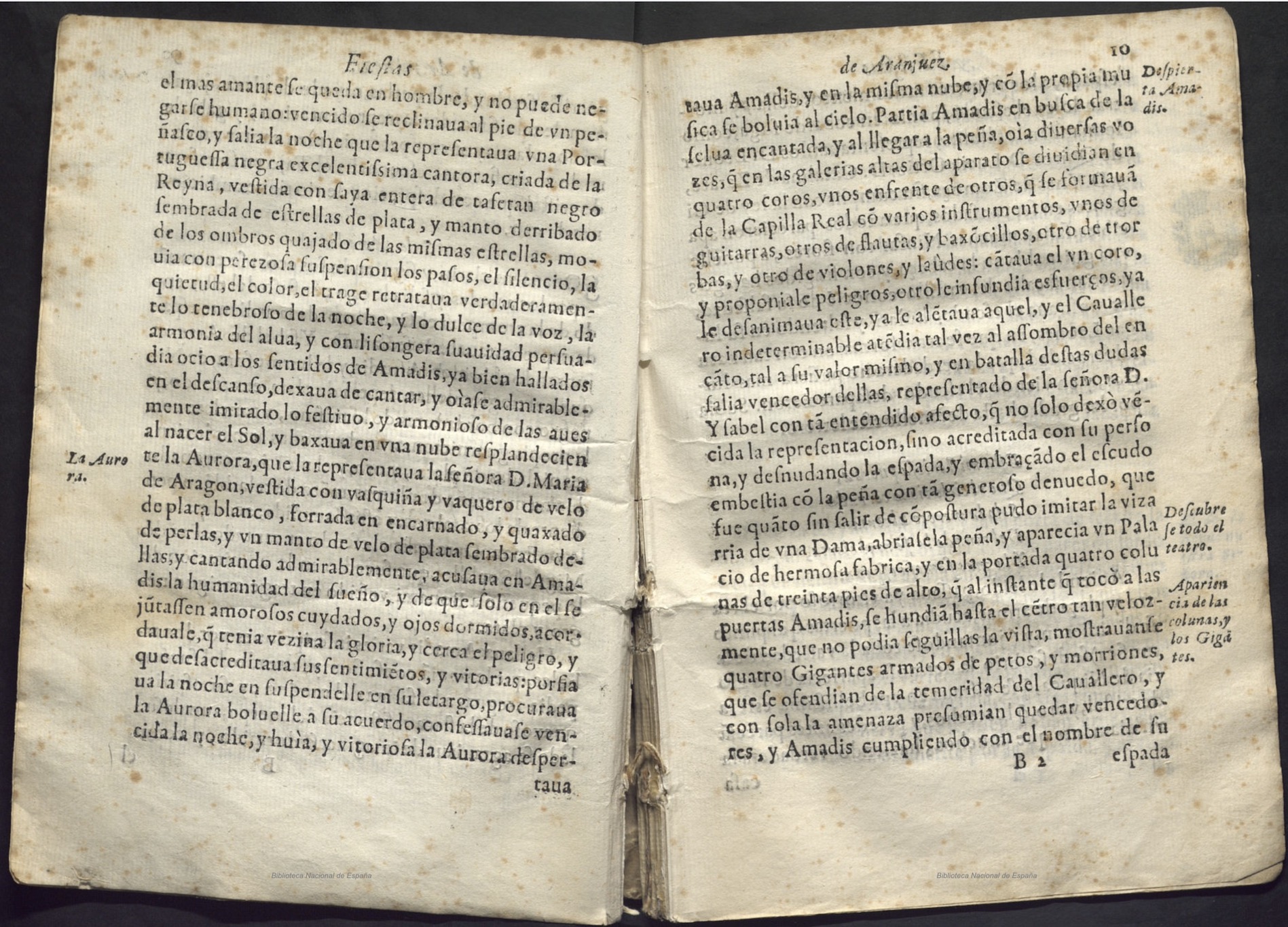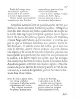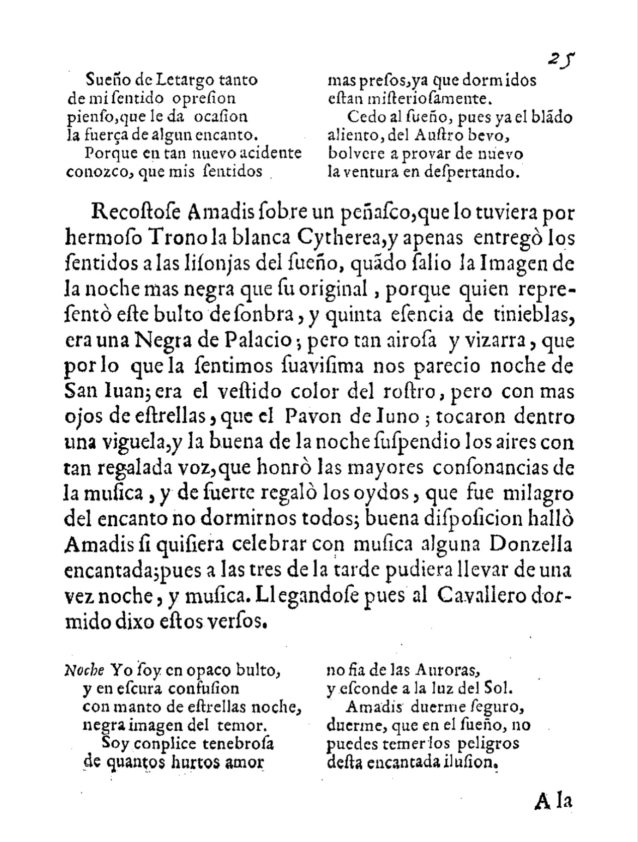 “Recostose Amadís sobre un peñasco, que lo tuviera por hermoso trono la blanca Citerea, y apenas entregó los sentidos a las lisonjas del sueño, cuando salió la imagen de la Noche, más negra que su original, porque quien representó este bulto de sombra y quinta esencia de tinieblas era una negra de palacio, pero tan airosa y bizarra que por lo que la sentimos suavísima nos pareció noche de San Juan. Era su vestido color del rostro, pero con más ojos de estrellas que el pavón de Juno. Tocaron dentro una vihuela, y la buena de la Noche suspendió los aires con tan regalada voz que honró las mayores consonancias de la música, y de suerte regaló los oídos, que fue milagro del encanto no dormirnos todos. Buena disposición halló Amadís, si quisiera celebrar con música alguna doncella encantada, pues a las tres de la tarde pudiera llevar de una vez noche y música. Llegándose pues al caballero dormido, dijo estos versos: Yo soy en opaco bulto…” (ver recurso).