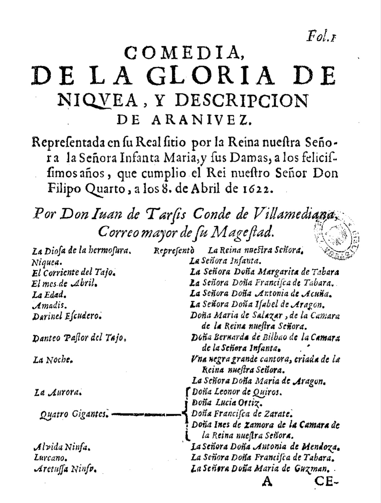 ¿Quién pudo ser esta Bernarda? Creo que, muy probablemente, puede ser identificada con “una negra, grande cantora, criada de la reina nuestra señora” que interpretó el personaje de “La Noche” en la fábula pastoril y máscara cortesana La gloria de Niquea de Juan de Tassis y Peralta, conde de Villamediana (ver recurso). Según se indica en su texto impreso de 1629, esta “comedia de la gloria de Niquea y descripción de Aranjuez”, fue “representada en su real sitio por la reina nuestra señora, la señora infanta María y sus damas a los felicísimos años que cumplió el rey nuestro señor D. Filipo Quarto a los 8 de abril de 1622”. En el texto de 1629 se especifica: “que toda la fiesta la representaron solas mujeres…”. El acontecimiento tuvo lugar el 15 de mayo, día de Pentecostés, en el teatro construido por Julio César Fontana, en el Jardín de la Isla, en el sitio de Aranjuez.