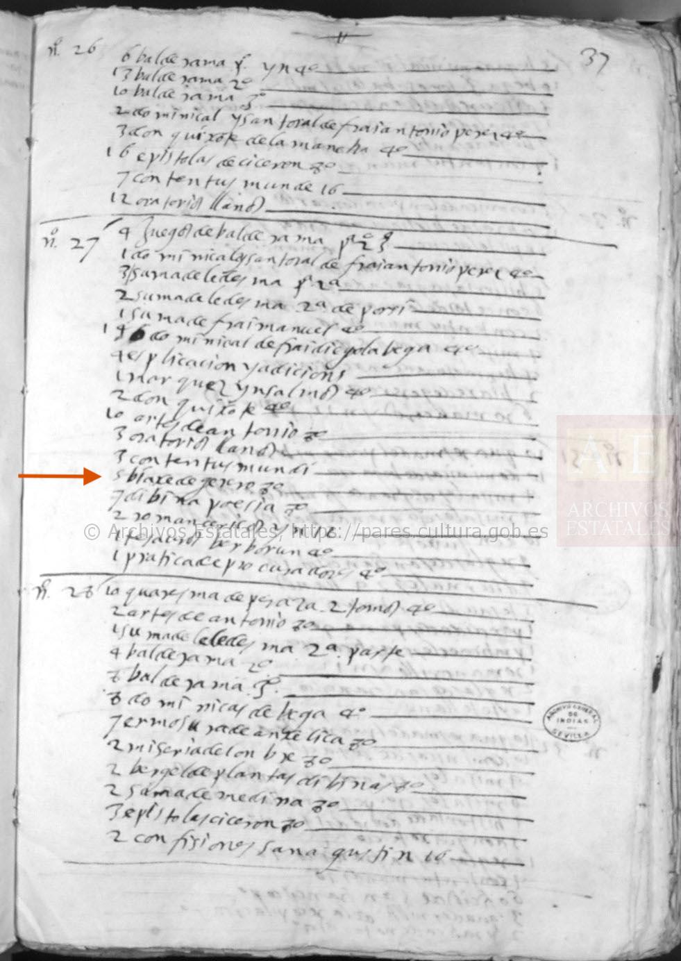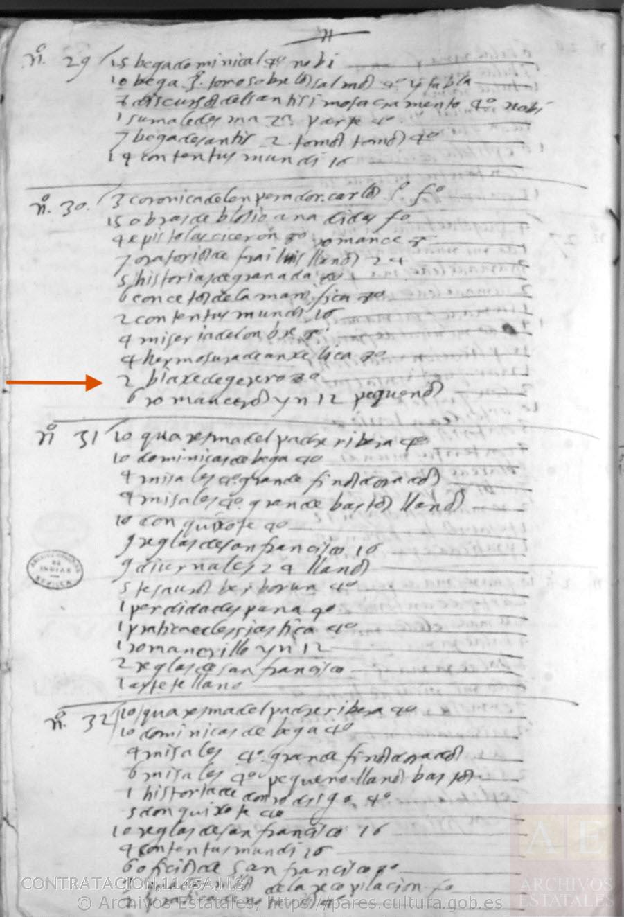 En el registro del navío Nuestra Señora del Rosario, pilotado por Hernando de Urquiza, que se conserva en el Archivo de Indias (Contratación, 1145A, N. 3) se recoge solo una parte de las sesenta y una cajas citadas, registradas por Juan de Sarriá, “mercader de libros, vecino de la villa de Alcalá de Henares”. En ese registro se da cuenta pormenorizada del contenido de:
