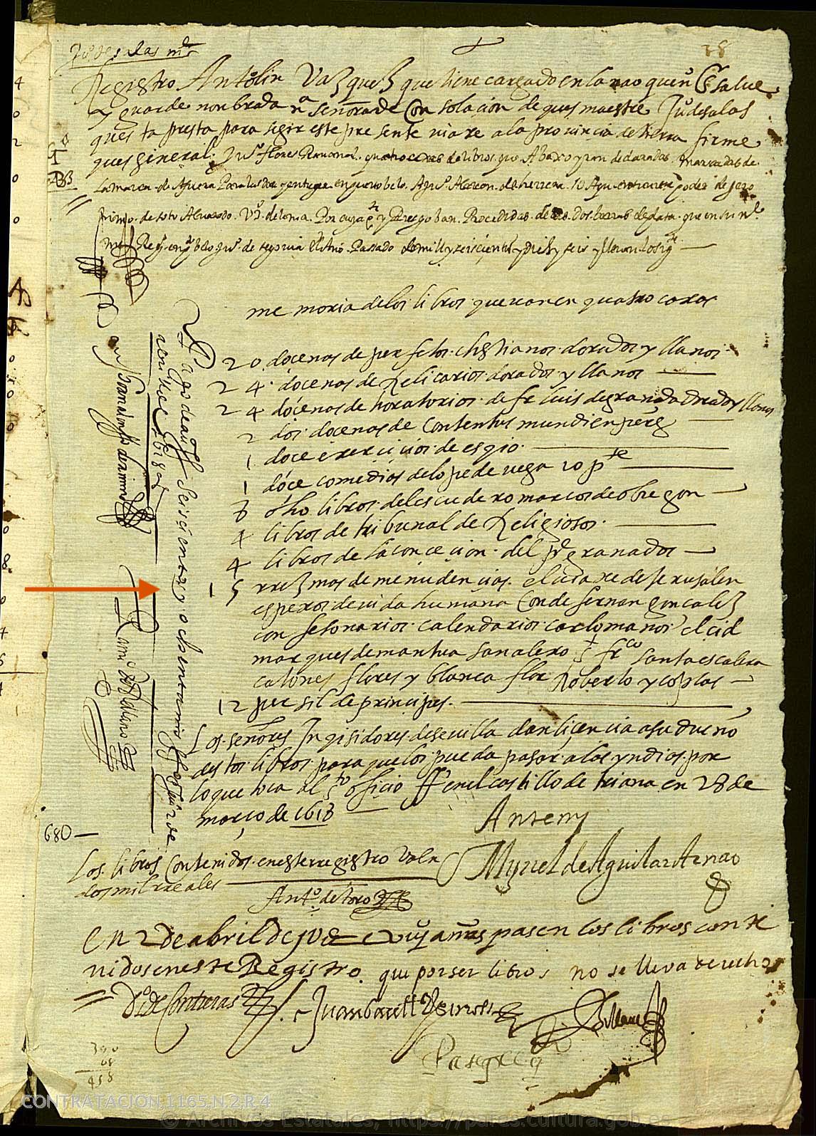 Trece años más tarde, el 2 de abril de 1618, el perulero Antolín Vázquez, vecino de Sevilla, cargaba en la nao Nuestra Señora de la Consolación, pilotada por Juan Salas, con destino a Portobelo, cuatro cajas de libros, “marcadas de la marca de afuera” (al margen del documento, ver recurso), cuya exportación había sido autorizada por la Inquisición hispalense en el Castillo de Triana el 28 de marzo de 1618. En Portobelo debían ser entregadas a Juan Alarcón Herrera que, estante en Sevilla, el 20 de abril de 1618 había conseguido la licencia pertinente para embarcarse de regreso a Perú. Los libros iban dirigidos al librero limeño Jerónimo Soto de Alvarado. Entre los volúmenes registrados que fueron enviados, encontramos: