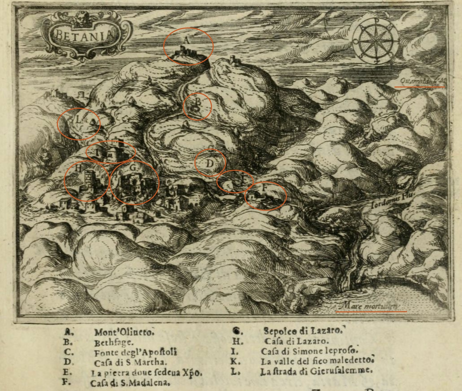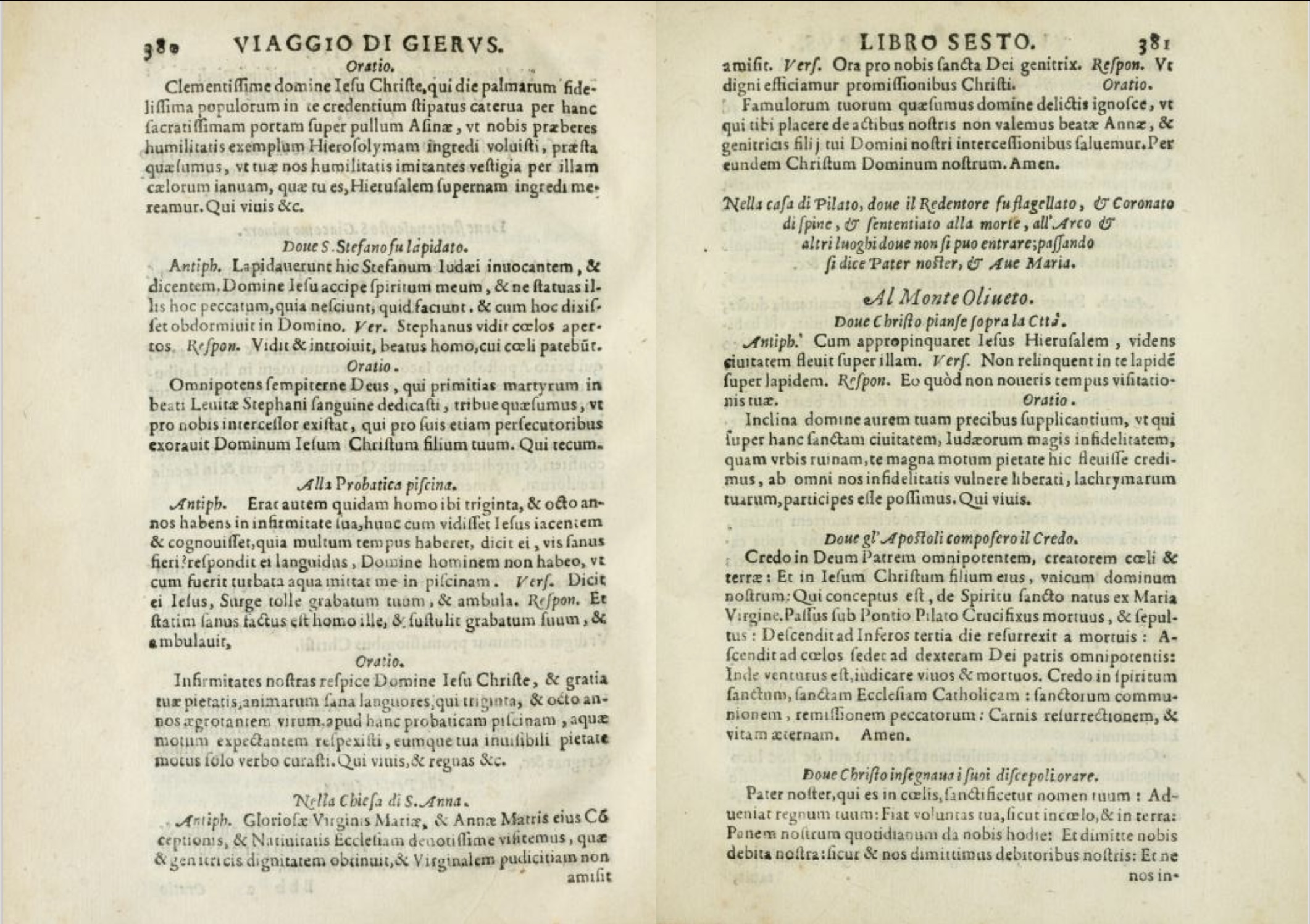 viaje , Lapidaverunt hic Stepanum (antífona) , Omnipotens sempiterne Deus qui primitias martirum in beati levitae Stephani (oratio) , Sancta Maria sucurre miseris (antífona) , Famulorum tuorum quaesumus Domine dilictis ignosce (oratio) , Pater Noster , Credo , Sedente Jesu super hunc montem Oliveti (antífona) , Presta nobis Domine Jesu Christe pater futuri saeculi (oratio) , Cum appropinquaret Jesus Hierusalem videns civitatem flevit super illam (antífona) , Inclina domine aurem tuam precibus supplicantium (oratio) , Jesu nostra redemptio / Salutis humane sator (himno) , O Rex gloriae domine virtutum (antífona) , Concede quaesumus onmipotens Deus (oratio) , Cum autem esset Jesus in Bethania in domo Simonis leprosi (antífona) , Fac nos quaesumus domine, exemplo beatae Mariae Magdalenae (oratio) , Intravit Jesus in hoc castellum et mulier quedam (antífona) , Dulcissime domine Jesu Christe qui pro tua summa pietate (oratio) , Nardi Maria pistici (himno) , Beatae Mariae Magdalenae, quaesumus domine suffragiis adiuvemur (oratio) , Jesus ergo rursum fremens in semet ipso venit ad hoc monumentum (oratio) , Omnipotens clementissime Deus, qui mundum innumerabilibus renovas beneficiis (oratio) , Nondum venerat Jesus in hoc castellum (antífona) , Consolator optime Jesu Christe benigne qui ad gaudium Mariae et Marthae sororum (oratio) , Cum appropinquasset Jesus Hierosolymis et venisset hic in Bethphage and montem Oliveti (antífona) , Omnipotens aeternae Deus, qui dominum nostrum Jesum Christum die azimorum (oratio) , Miquel Matas. La devota peregrinació de la Terra Sancta , Jean Zuallart. Il devotissimo viaggio di Gerusalemne , Itinerario del viaje a Jerusalén de Francisco Guerrero , cartografiando Francisco Guerrero , Miquel Matas (sacerdote) , Jean Zuallart (alcalde, peregrino)