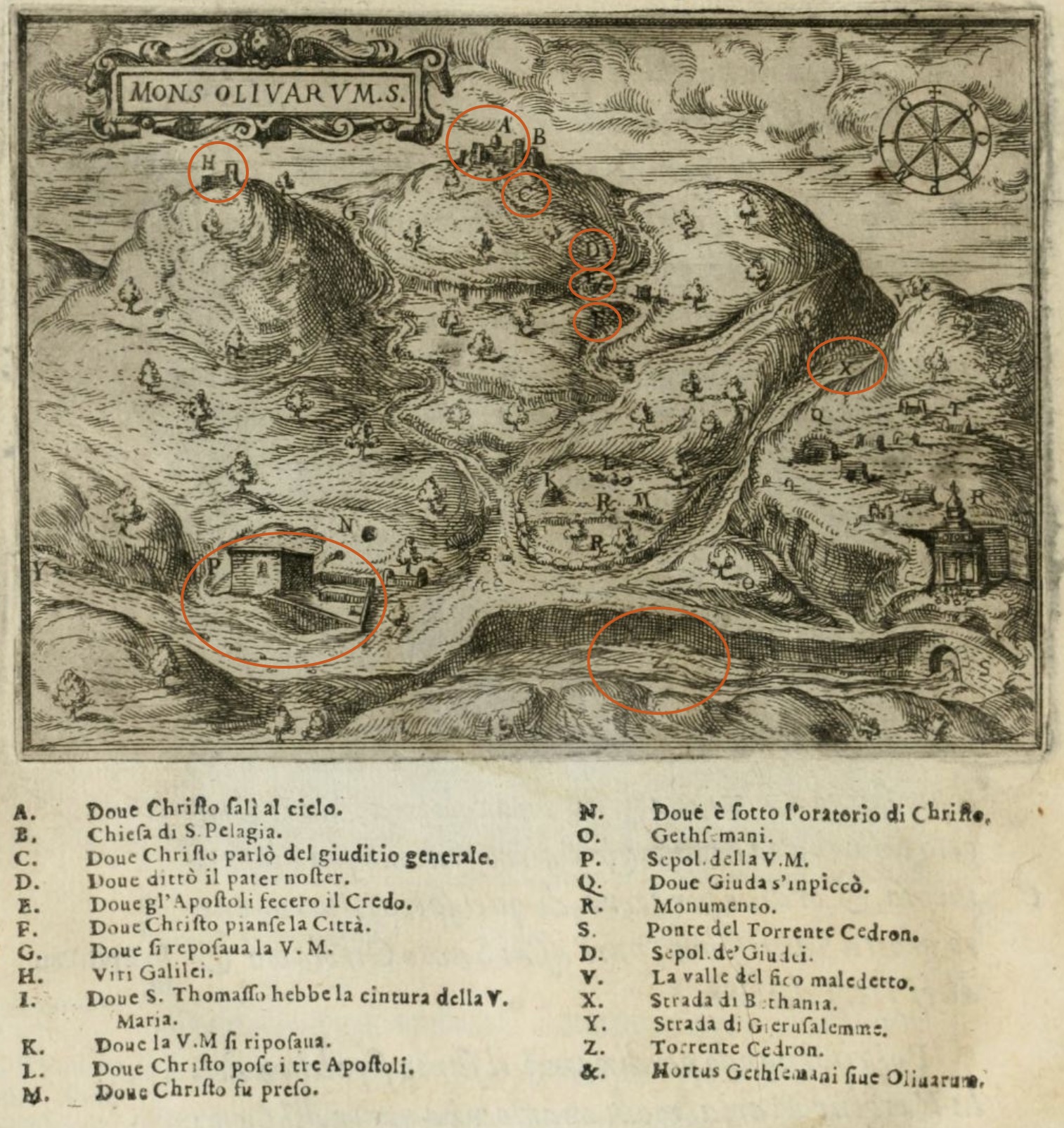 En el caso de Miquel Matas, queda claro que recorrió las estaciones del Valle de Josafat y del Monte de los Olivos en la misma jornada del 22 de agosto de 1602. En el apéndice de su libro El devoto peregrino, viage de Tierra Santa deja constancia de los rezos y cánticos que los peregrinos hacían en las estaciones que allí visitaban. Como en artículos anteriores, las he cotejado con las del apéndice “Cominciano le orationi che si dicono ne’luoghi santi di Gierusalemme, con altre convenevoli a dire, per i pellegrini” (Libro sesto, p. 362) de Il devotissimo viaggio di Gerusalemne de Jean Zuallart, publicado en Roma en 1587. Ambas fuentes mantienen una consistencia que pone de manifiesto la pervivencia de estos textos.