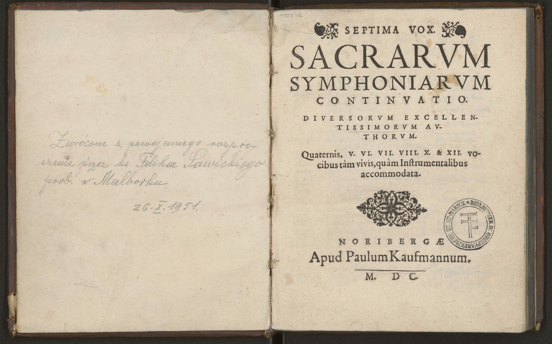 * Sacrarum symphoniarum continuatio. Diversorum excellentissimorum authorum. Quaternis, V. VI. VII. VIII. X. & 12 vocibus tam vivis, quam Instrumentalibus accommodata. Núremberg: Paul Kaufmann, 1600 [B/I 16002]. [PL-GD Bibl. Mar. q. 82-87].