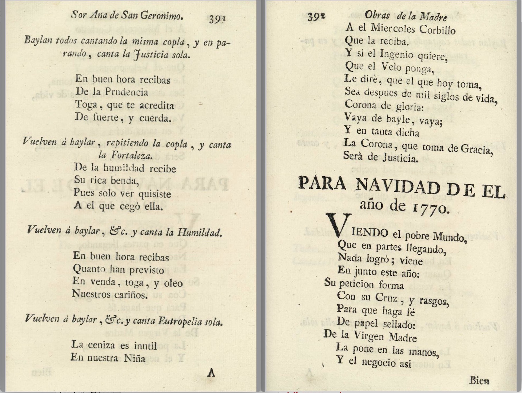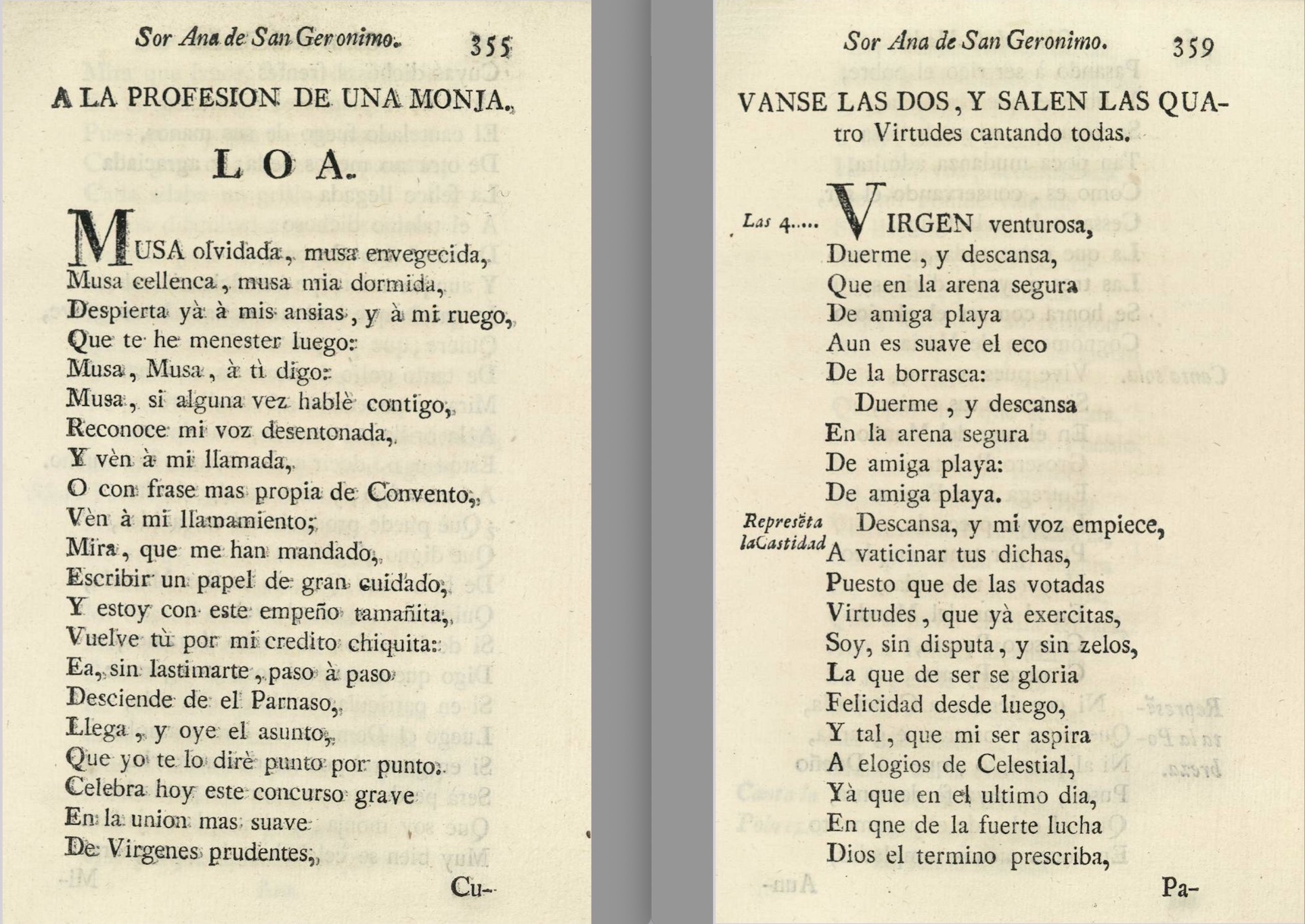 * La primera tiene como indicación simplemente “A la profesión de una monja. Loa” (pp. 355-364). La loa “Musa olvidada, musa envejecida”, de corta duración, mantiene las características tardo barrocas de este género. Sor Ana, muy probablemente, pudo participar en la representación recitando la introducción. A su llamada acude la Musa, en cuya intervención no faltan las referencias musicales. El elenco se completa con la personificación de los cuatro votos que hacían las monjas en su profesión, a la que el texto denomina “virtudes”: Castidad, Pobreza, Obediencia y Clausura. Estas personificaciones aparecen cantando, a cuatro, “Virgen venturosa”, para continuar cada una de ellas con una intervención recitada y otra cantada a solo, con versificación y recursos métricos similares a la introducción a cuatro. El texto nos proporciona el nombre de la monja que profesaba, sor Micaela.