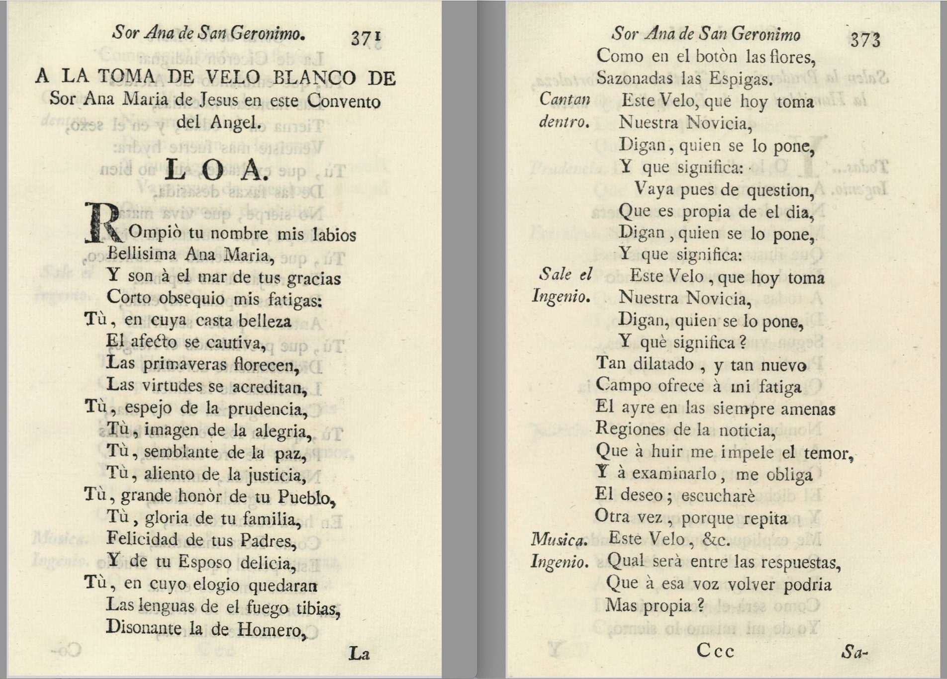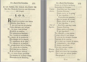 * En la segunda se indica: “A la toma de velo blanco de sor Ana de Jesús en este convento del Ángel (pp. 371-392). Esta loa, “Rompió tu nombre mis labios”, es más extensa y compleja. Tiene como tema central el significado de la toma del velo blanco, el cual se expresa cantado, fuera de escena, tras la introducción recitada, en un texto que actúa de estribillo: “Este velo, que hoy toma / nuestra novicia, / digan quién se lo pone / y qué significa. / Vaya pues de cuestión, / que es la propia del día, / digan quién se lo pone / y qué significa”.