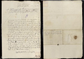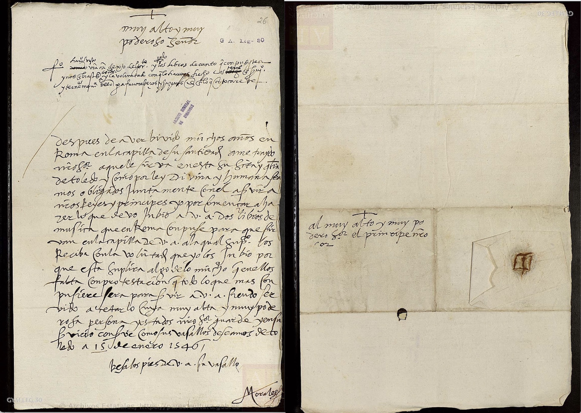 En el vuelto de la carta, Morales escribe únicamente el destinatario de su misiva: “Al muy alto y muy poderoso señor el príncipe nuestro señor”.
