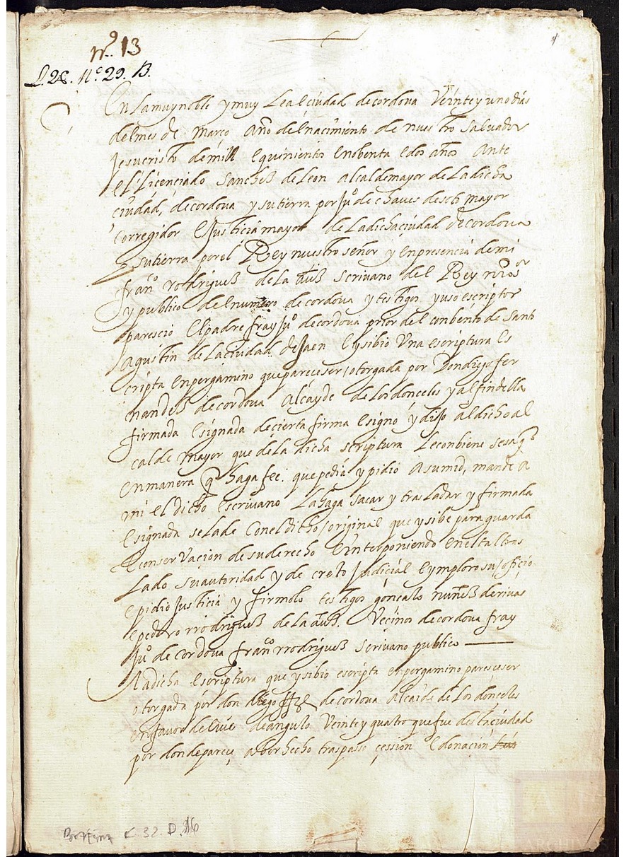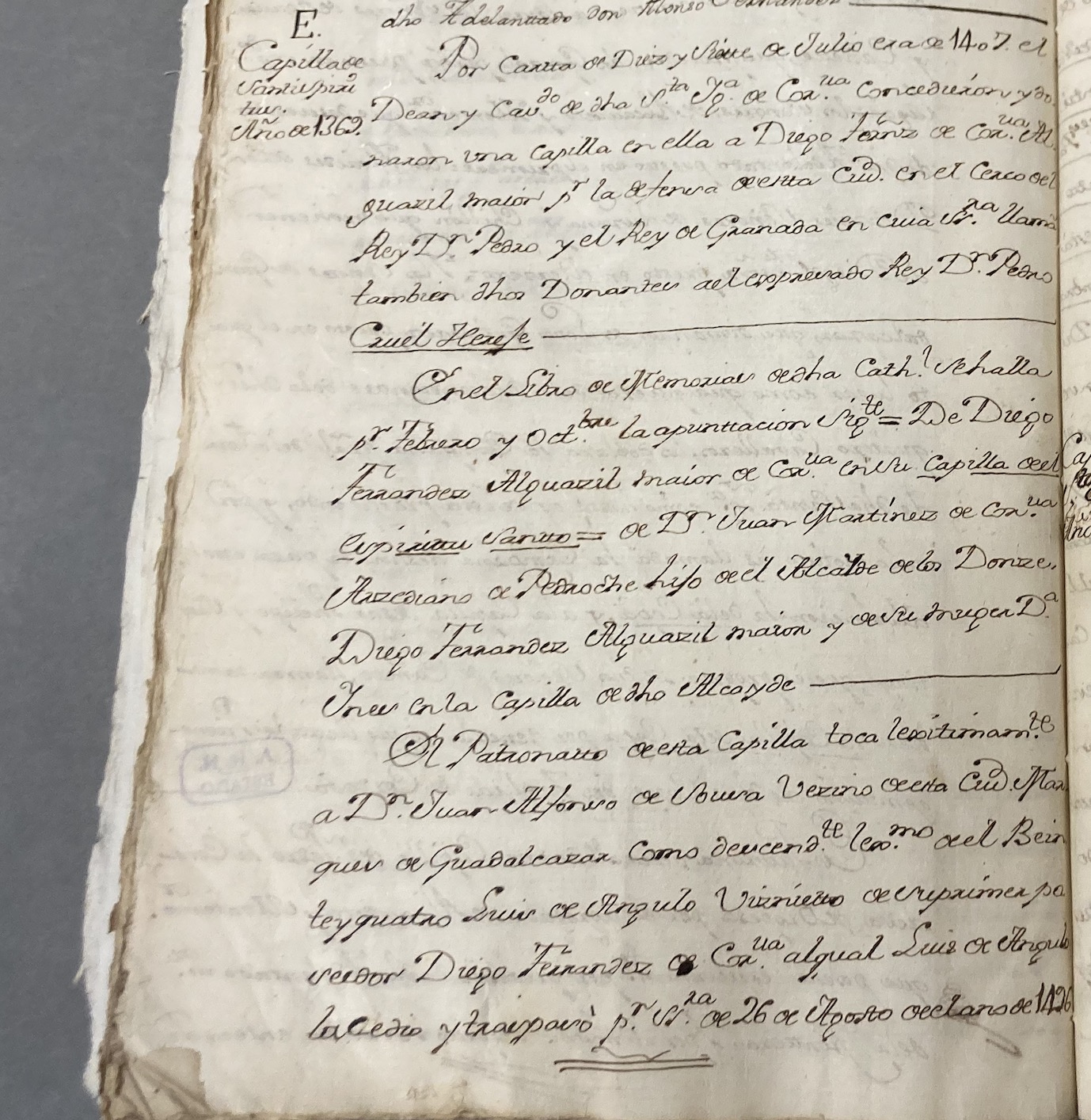 El documento que protocolizaba la donación del espacio para su capilla funeraria pasó ante el notario apostólico Pedro Ruiz en la fecha citada. Lo que se ha conservado es un traslado del documento original, a tenor de la letra probablemente de finales del siglo XVI. La escritura de donación de esta capilla es de singular importancia, ya que nos aclara algunos detalles sobre la configuración del espacio del coro catedralicio y de sus funcionalidades rituales c. 1369. El deán y cabildo justifican la concesión de este espacio por las “buenas obras” que Diego Fernández de Córdoba y sus antecesores habían hecho a la cristiandad, a la institución y a ellos en particular desde la conquista de la ciudad, entre las que se encontraba la defensa de la ciudad un año antes, en 1368, contra los ejércitos de Pedro I y de Muhammad V: