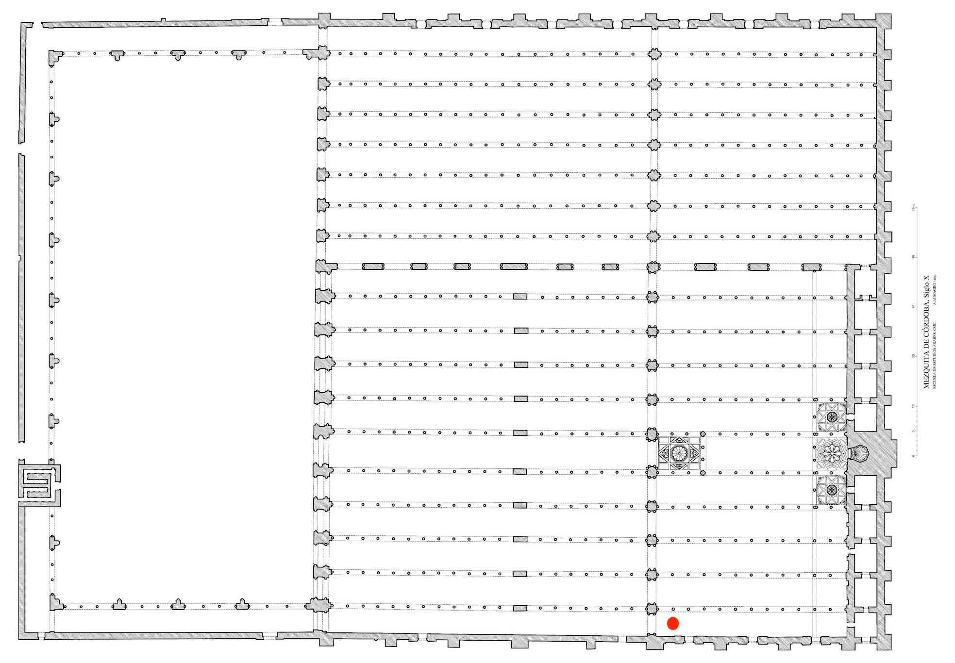 - Mi hipótesis es que la capilla del Espíritu Santo se ubicaba en la primera nave del muro oeste, muy probablemente lindaba con la capilla/altar de San Lorenzo, y como especifica el documento de donación de 1369, ocupaba dos intercolumnios, “tres mármoles y dos lumbres” (referidos a las tres columnas y los dos arcos). La reja (“red”), debía seguir la línea de las columnas que delimitaban esta primera nave, para dejar expedita la segunda nave.