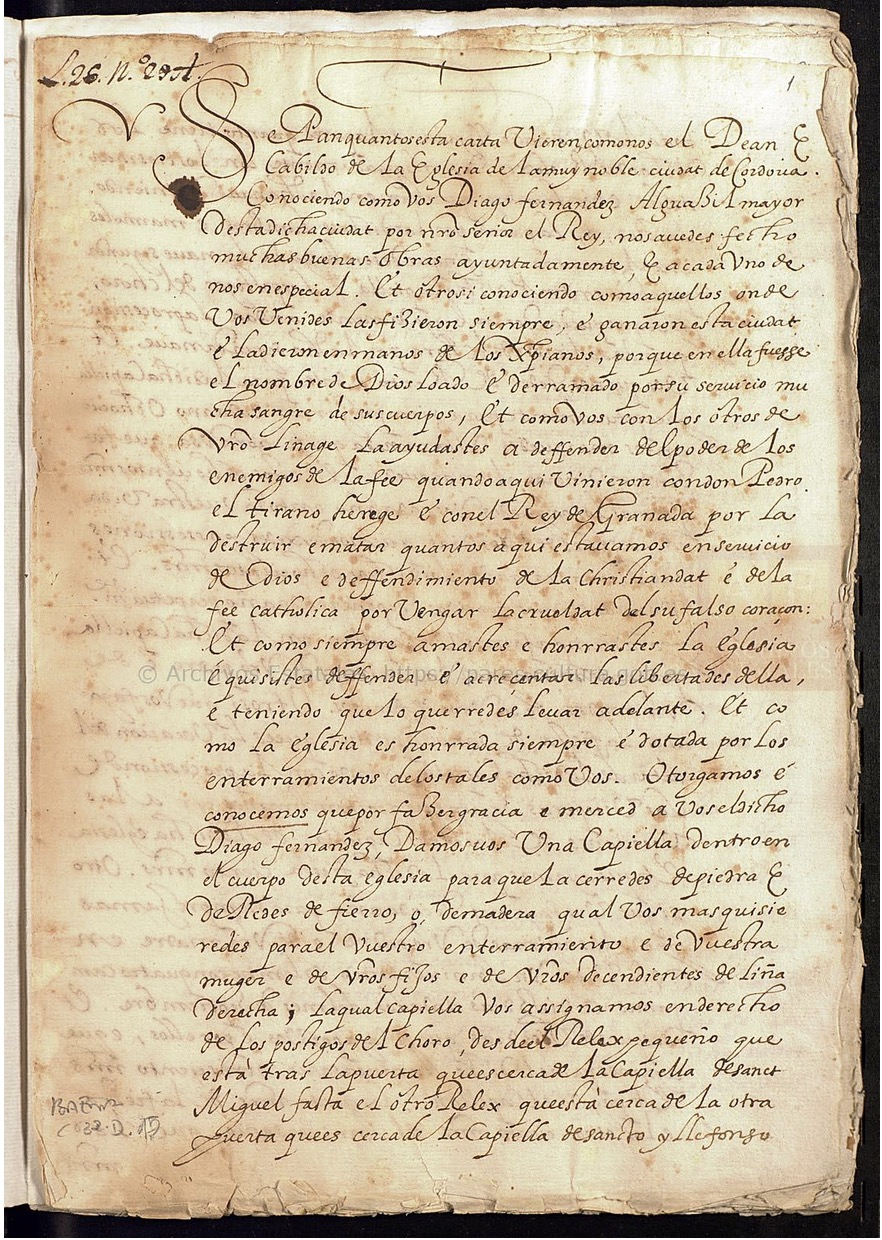 “E como la eglesia es horrada siempre e dotada por los enterramientos de los tales como vos, otorgamos e conocemos que por facer gracia e merced a vos el dicho Diego Fernández damos vos una capilla dentro, en el cuerpo desta eglesia, para que la cerredes de piedra e de redes de fierro o de madera, cual vos quisiéredes, para el vuestro enterramiento e de vuestra mujer, e de vuestros hijos e de vuestros descendientes de línea derecha”.