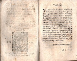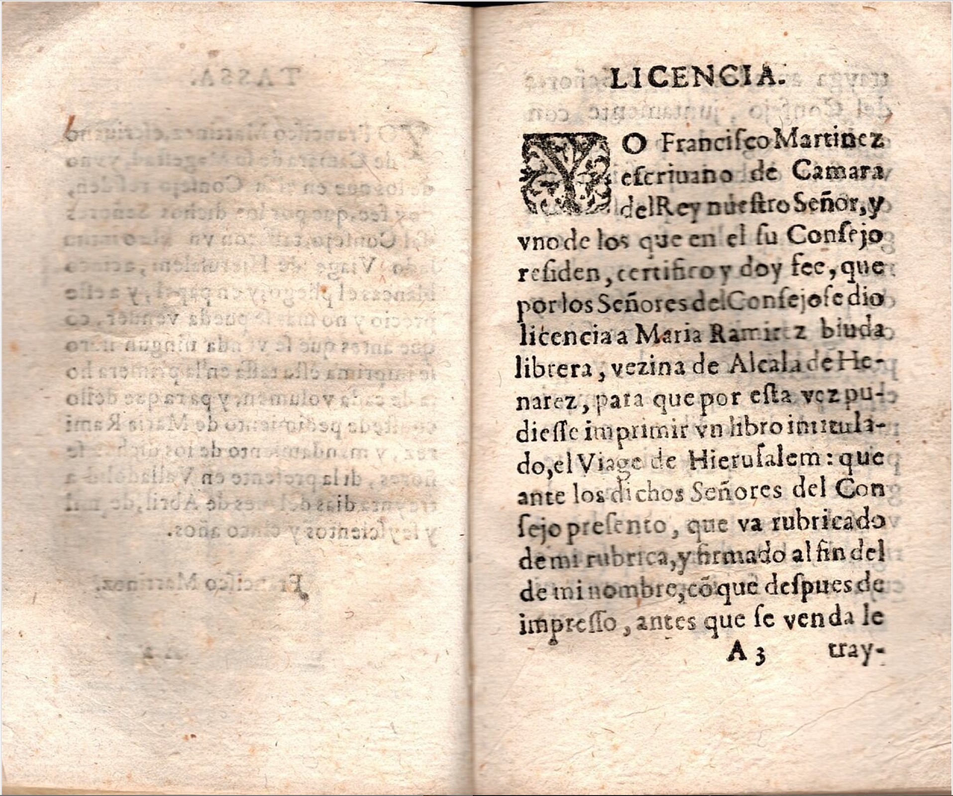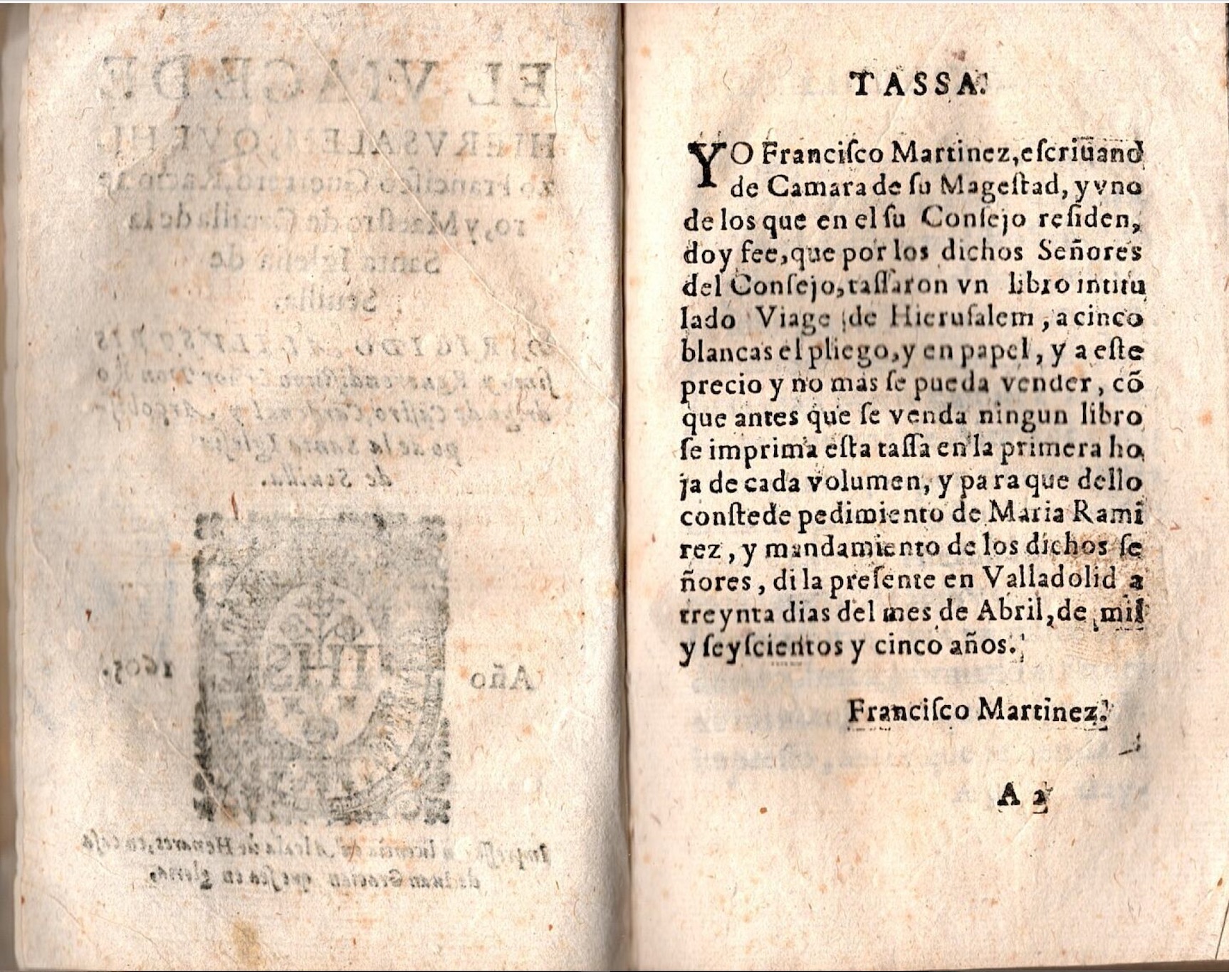 La tasa, solicitada igualmente por María Ramírez, especifica que en el Consejo: “tasaron un libro intitulado Viage de Hierusalem, a cinco blancas el pliego, y en papel, y a este precio y no más se pueda vender”. Está fechada en Valladolid a 30 de abril de 1605 y firmada por Francisco Martínez, escribano de Cámara del rey.