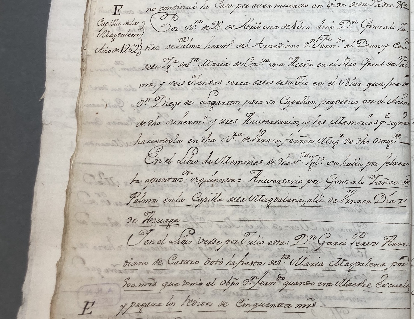 dotación de capilla , memorias , aniversario , fiesta de Santa María Magdalena , proyecto CateCArq , Gonzalo Yáñez de Palma , Urraca Fernández , Urraca Díaz de Azuaga , Garci Pérez (canónigo, arcediano de Castro, maestrecuela)
