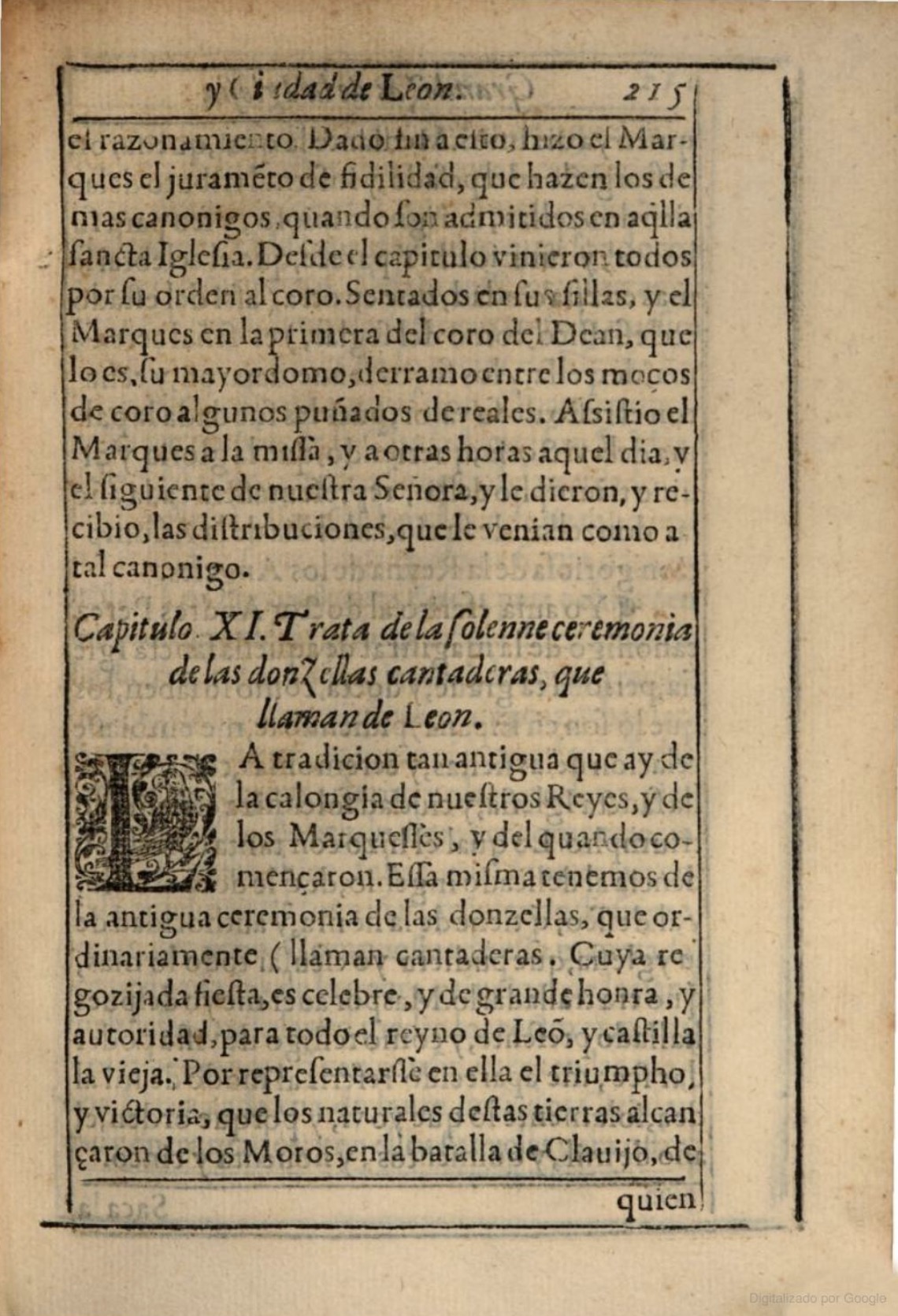 Fray Anastasio de Lobera, en el capítulo XI de su Historia de las grandezas de la muy antigua e insigne ciudad de León, impresa en 1596, nos da pormenorizada cuenta de los orígenes y ejecución de un importante ritual que se celebraba anualmente en León: la ceremonia de las doncellas cantaderas.