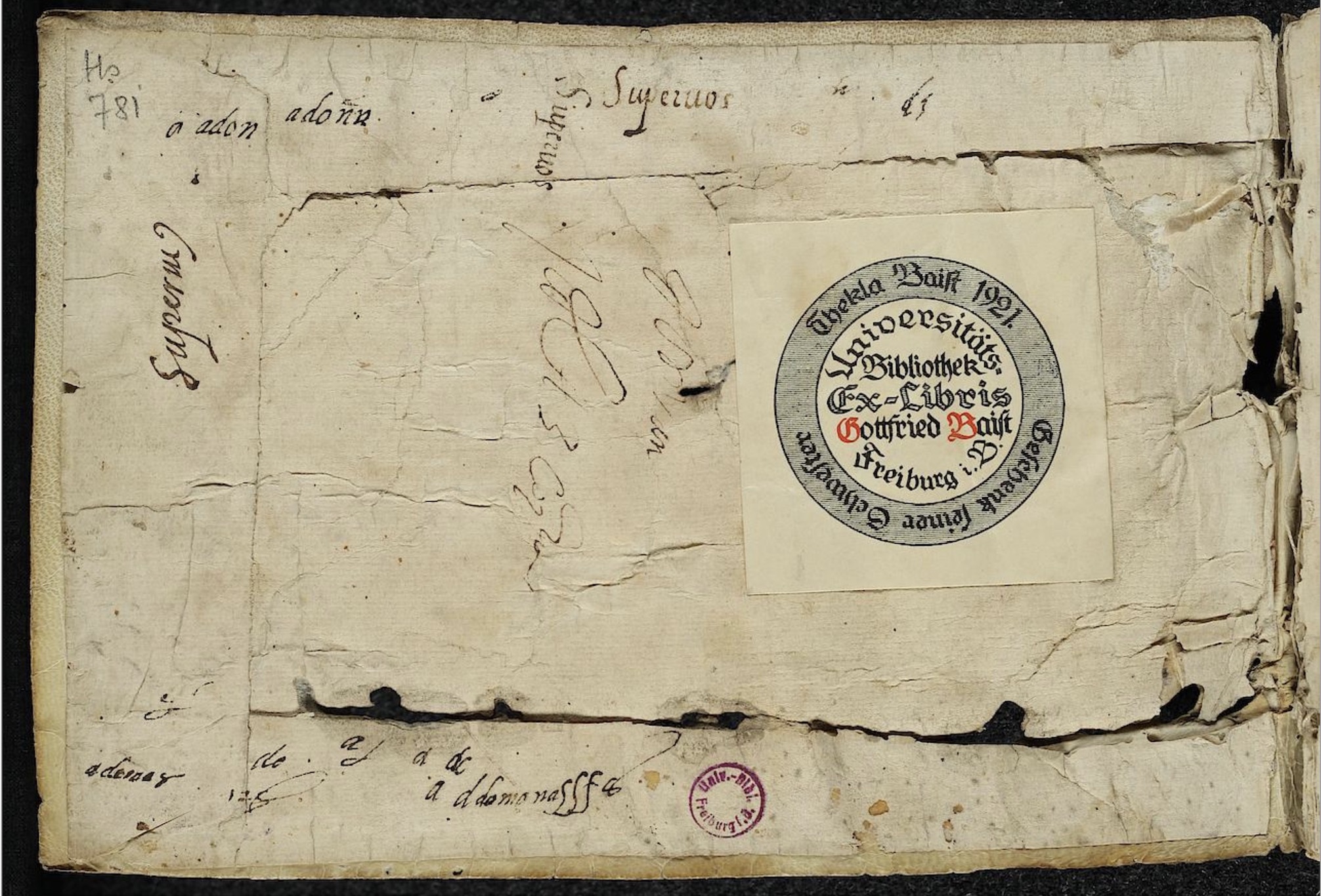 El exlibris que tiene pegado en la guarda anterior nos proporciona información sobre su procedencia: “Universitäts-Bibliothek Freiburg i. B Ex Libris Gottfried Baist. Geschenk seiner Schwester Thekla Baist 1921”. Fue donado, por lo tanto, por la hermana de su propietario, Gottfried Baist (1853-1920), el cual ejerció la docencia como profesor de Filología Románica en la Universidad de Friburgo desde 1891 hasta 1918. Reconocido hispanista, viajó por Francia, España, Italia e Inglaterra, adquiriendo diversos volúmenes entre los que probablemente se encontraba el que nos ocupa en este artículo.